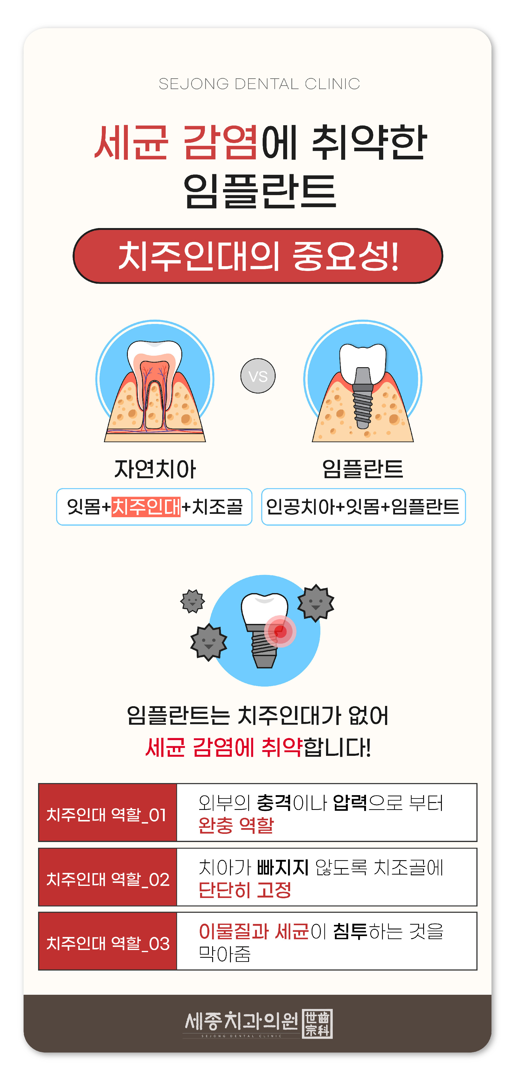 치주인대는 생각보다 중요한 기능을 하는데요, 치아와 잇몸 사이에서 존재하여 음식물을 씹을 때 쿠션처럼 완충 작용을 하며 잇몸 안으로 세균이 침투하는 것을 막아줍니다. 임플란트는 세균을 막아주는 치주인대가 없기 때문에 세균에 취약합니다. 임플란트 주변으로 구강 위생 관리를 잘해줘야 하는 이유입니다.