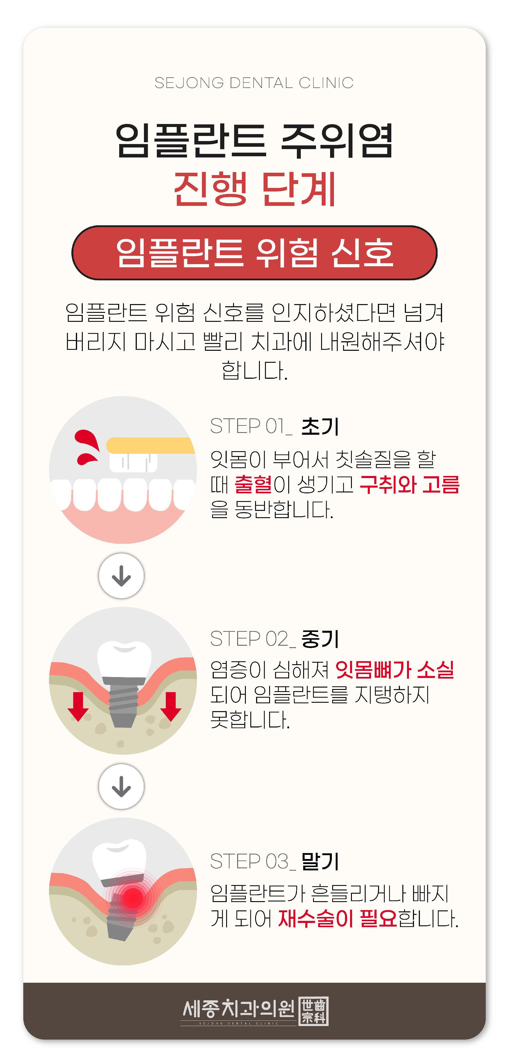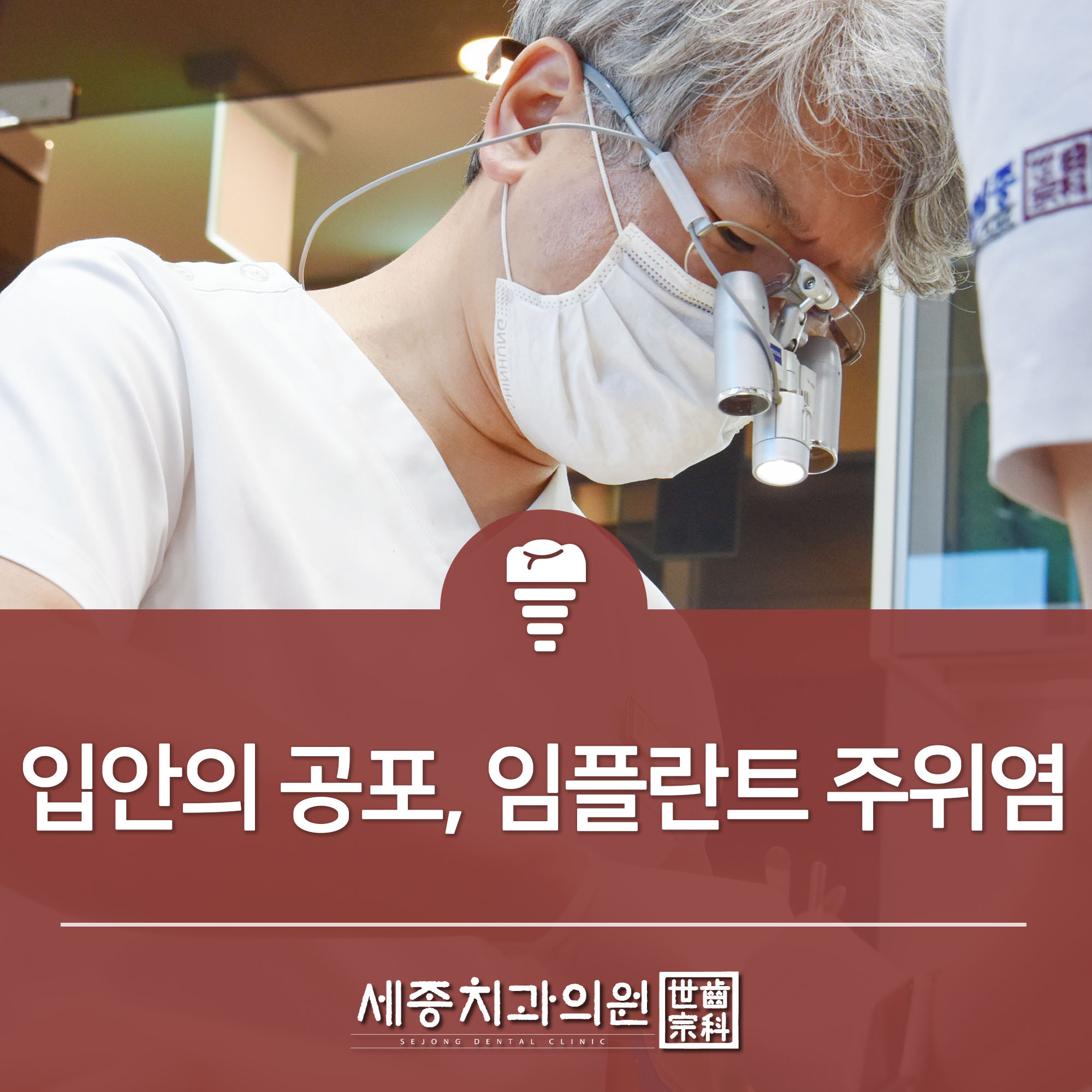 안녕하세요, 세종치과입니다. 임플란트 수술을 받은 후, 구강 관리 어떻게 하고 계시나요? 썩지 않는 인공치아(임플란트)를 심었다고 방심하고 구강 관리에 소홀하지 않았나요? 임플란트 수술받기 전보다 오히려 더 열심히 구강 관리를 해야 한다고 누누이 강조 드려 왔는데요. 구강 위생 관리에 실패하면 잇몸뼈가 녹을 수도 있다는 것, 알고 계시나요? 잇몸뼈가 녹는 증상은 임플란트 수술 후 발생하는 부작용 중 하나입니다. 이것이 바로 입안의 공포, 임플란트 주위염입니다.
