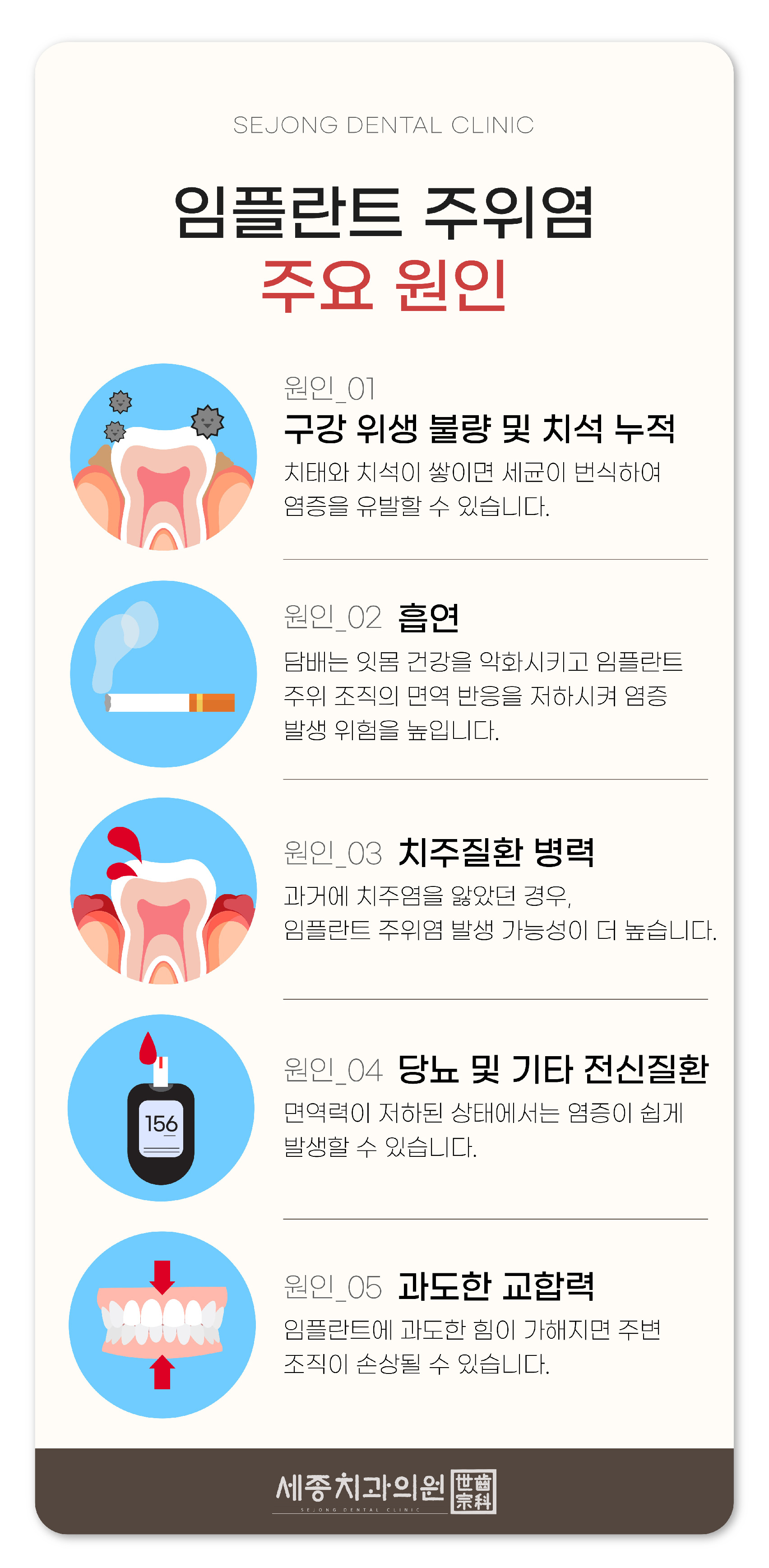임플란트 주위염은 임플란트 주변 잇몸과 뼈에 염증이 생기는 질환으로, 초기에는 통증이 거의 자각하기 어렵지만 방치하면 임플란트가 흔들리거나 탈락할 수 있습니다. 주요 원인으로는 불충분한 구강위생, 치석 누적, 과도한 교합력, 흡연, 당뇨 등이 있으며, 특히 기존에 치주염 병력이 있는 경우 발생 위험도가 높습니다. 1. 구강 위생 불량 및 치석 누적 : 치태와 치석이 쌓이면 세균이 번식하여 염증을 유발할 수 있습니다. 2. 흡연 : 담배는 잇몸 건강을 악화시키고 임플란트 주위 조직의 면역 반응을 저하시켜 염증 발생 위험을 높입니다. 3. 치주질환 병력 : 과거에 치주염을 앓았던 경우, 임플란트 주위염 발생 가능성이 더 높습니다. 4. 당뇨 및 기타 전신질환 : 면역력이 저하된 상태에서는 염증이 쉽게 발생할 수 있습니다. 5. 과도한 교합력 : 임플란트에 과도한 힘이 가해지면 주변 조직이 손상될 수 있습니다.