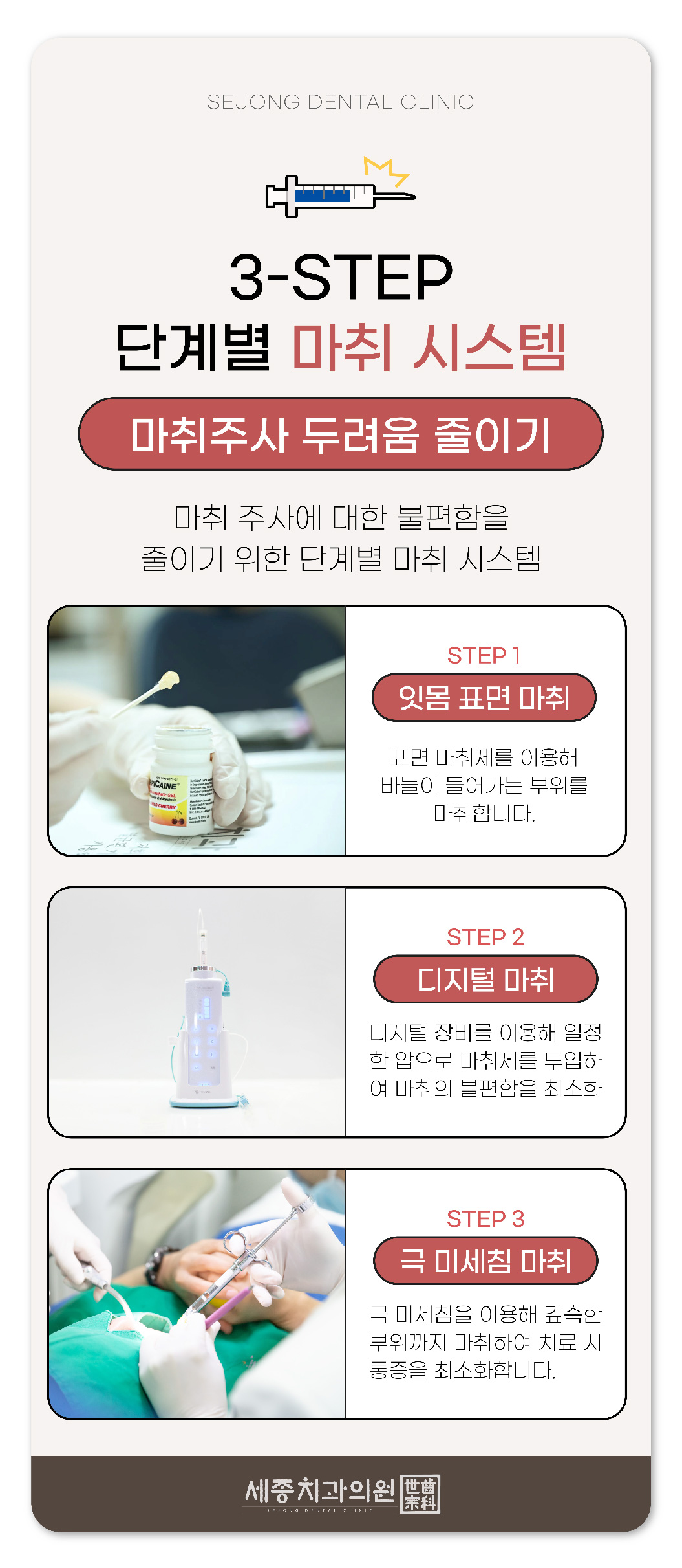 2단계 디지털 마취 장비로 일정한 압으로 마취제를 투입하여 통증을 최소화합니다.