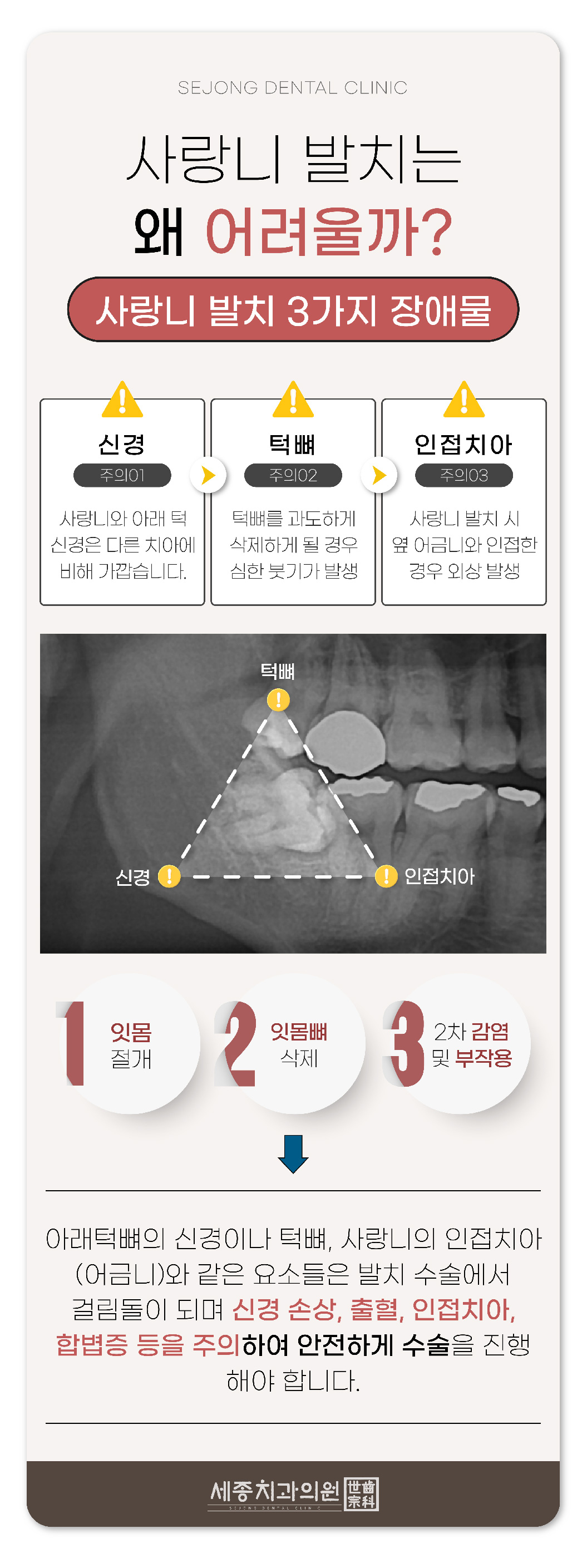 아래턱뼈의 신경이나 턱뼈, 사랑니의 인접 치아(어금니)와 같은 요소들은 발치 수술에서