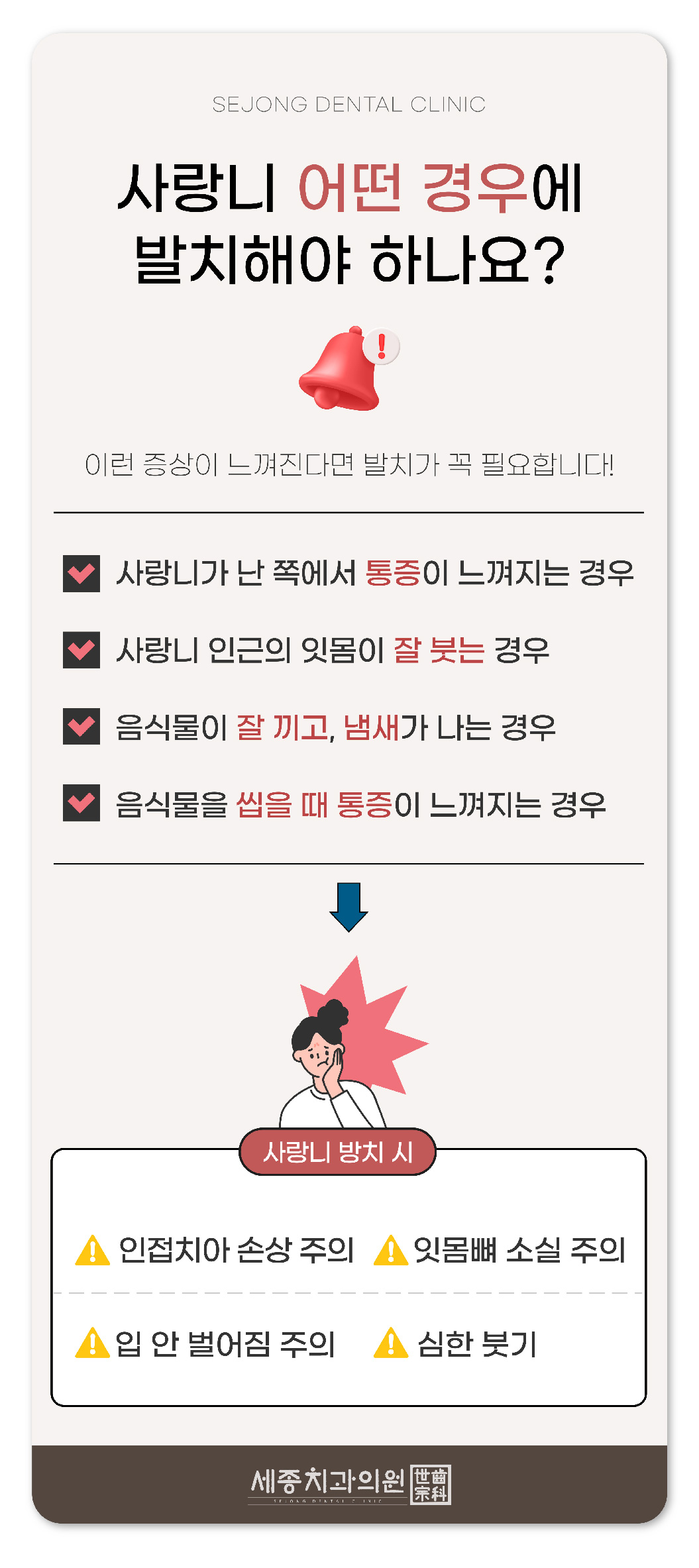 사랑니를 뽑지 않고 방치하게 되면 극심한 충치로 인해 사랑니와 인접 치아까지 손상될 수 있으며,