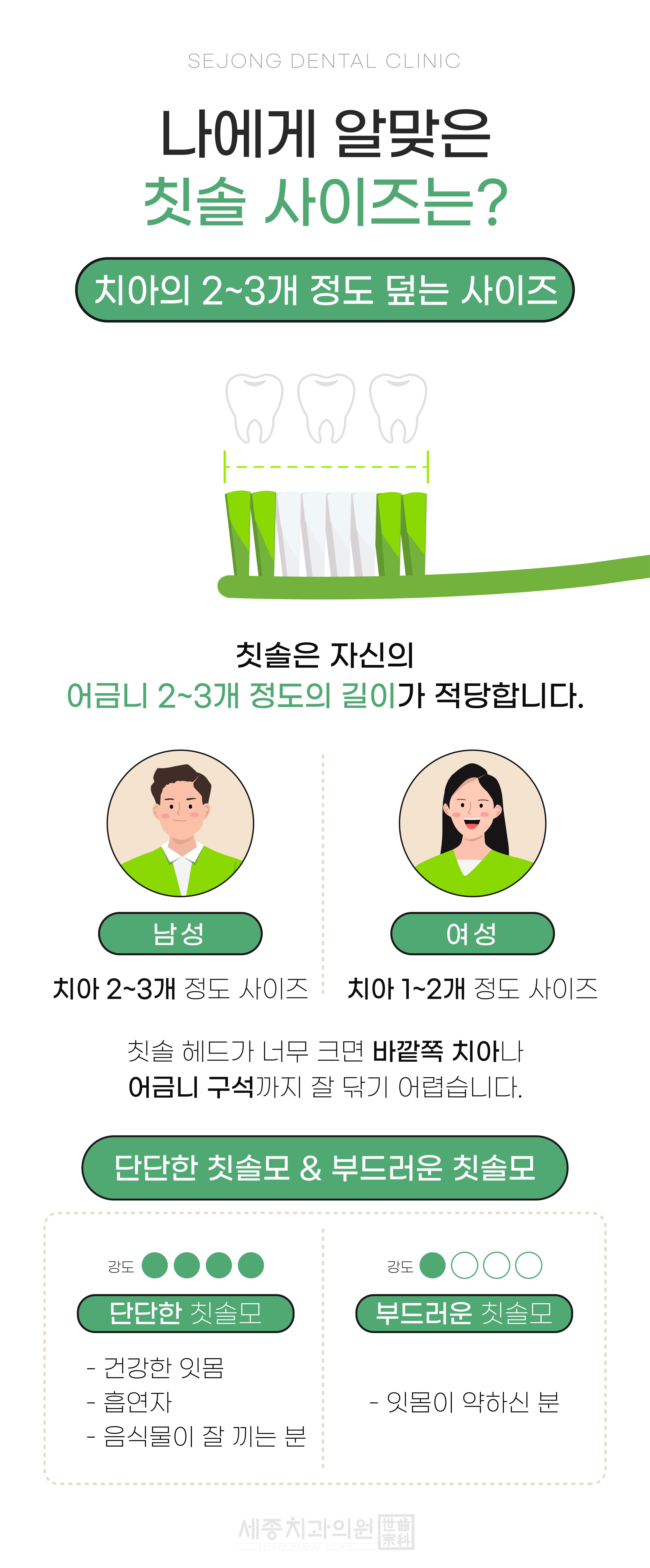 보통 남성은 자기 치아의 2~3개, 여성은 1~2개에 해당하는 크기의 칫솔모가 적당합니다.