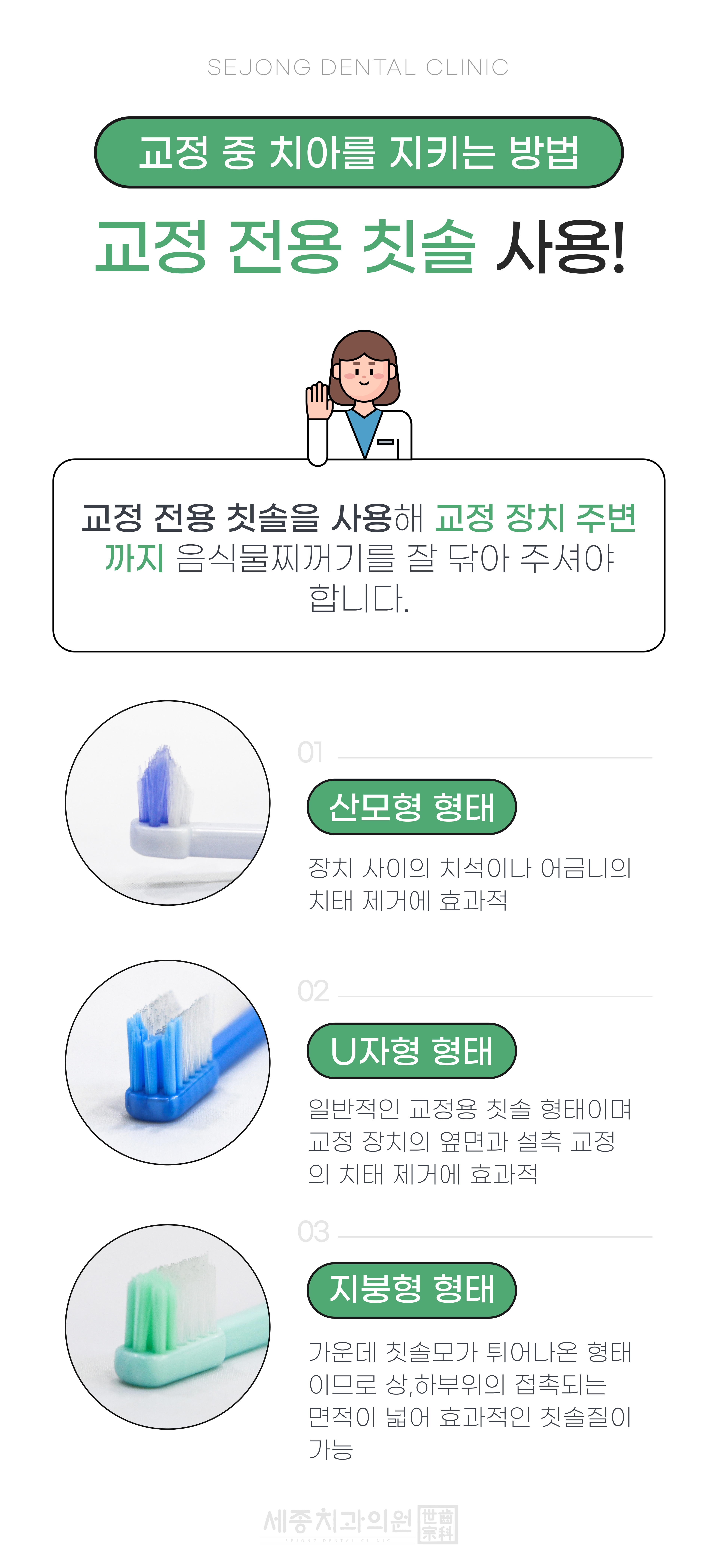 U자형, 지붕형, V자형, 교정 칫솔을 사용해서 교정 장치 주변도 깨끗하게 닦아주세요.