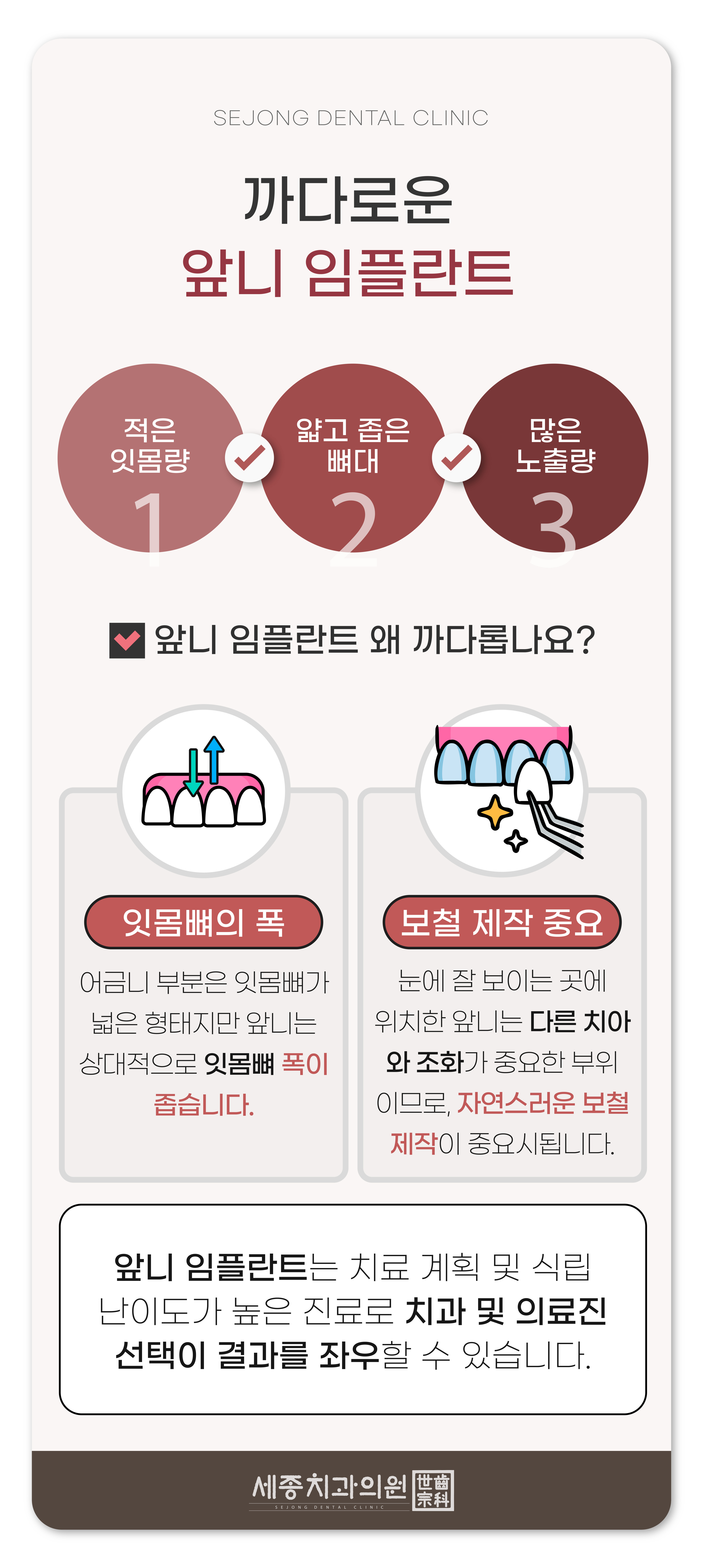 게다가 앞니 부위는 잇몸의 폭이 좁고 얇기 때문에 단단히 고정시키기 어려워 수술의 난이도가 높습니다.