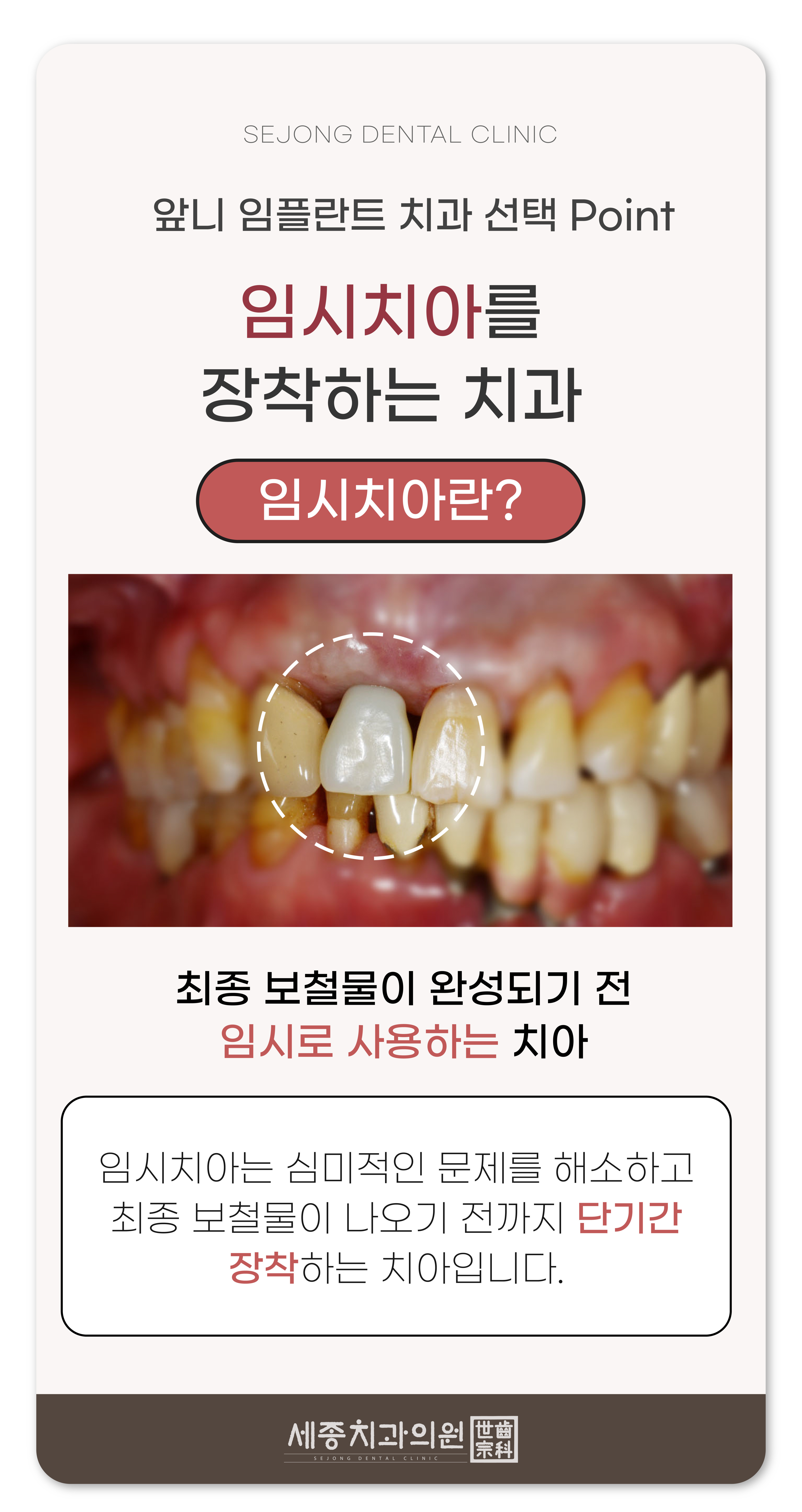 앞니 임플란트 치료받는 동안 앞니가 없는 불편함을 해결하기 위해 임시치아를 장착하는지 확인해 보세요.