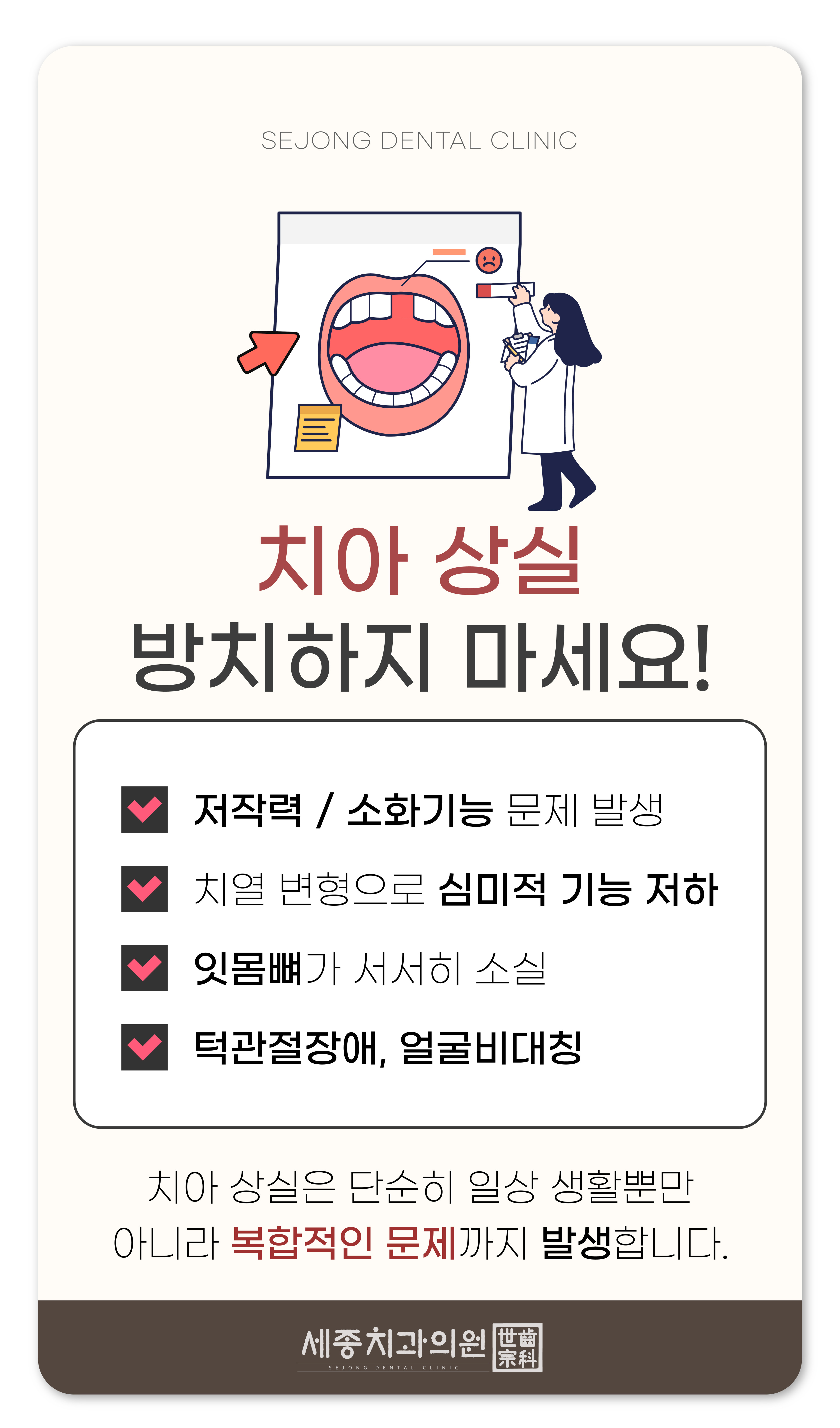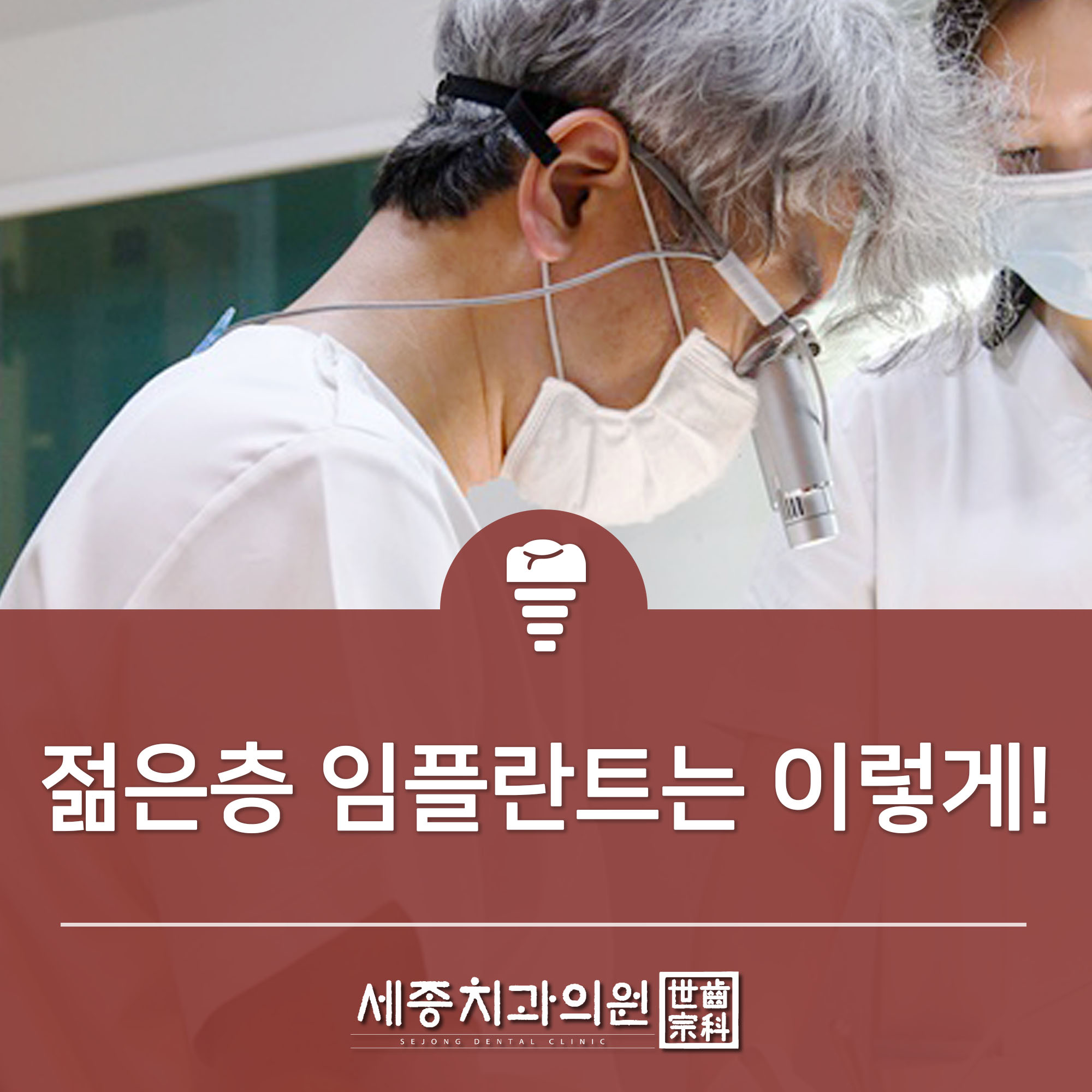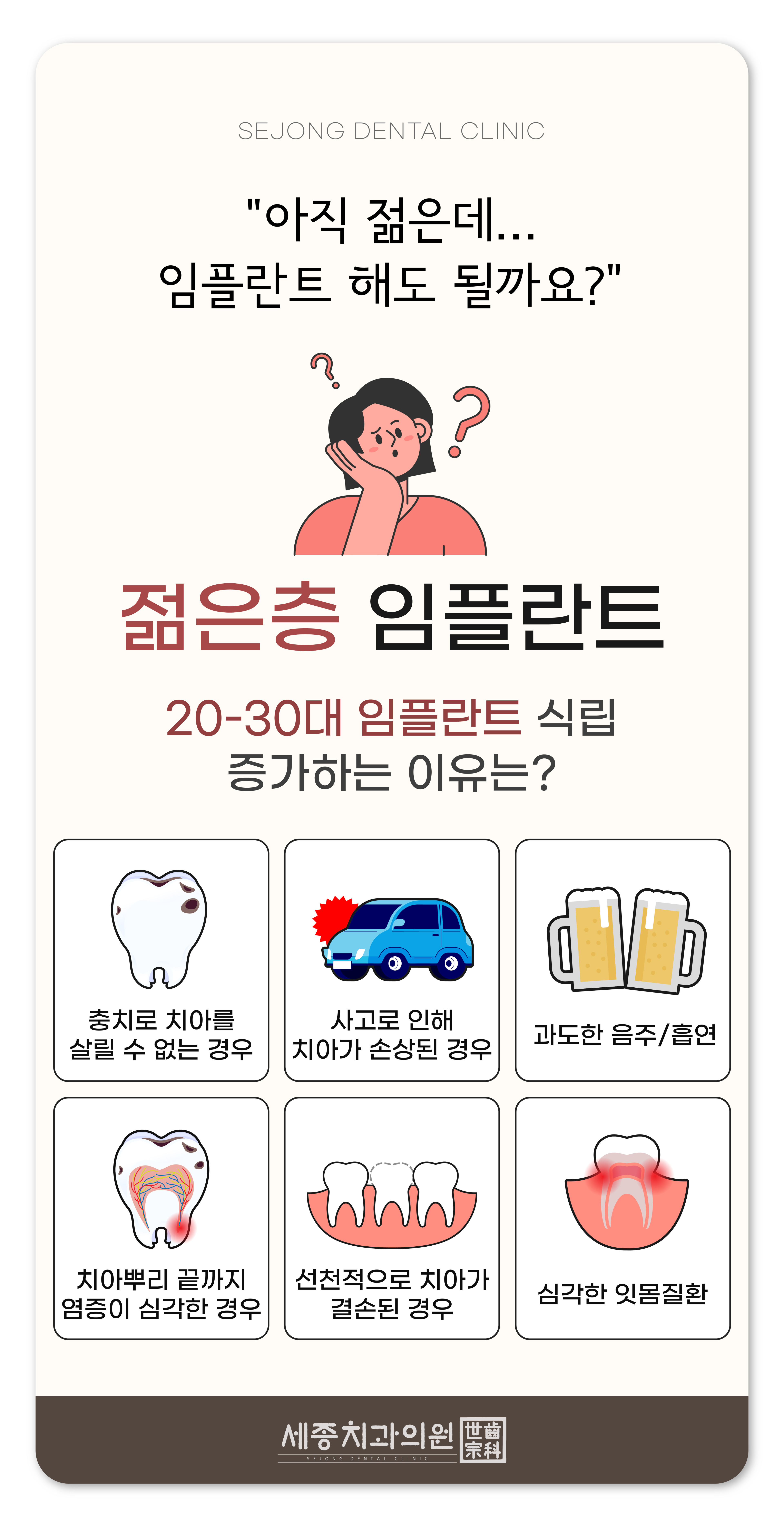 안녕하세요, 세종치과입니다. 임플란트 치료는 중장년층이 받는 치료라는 고정관념이 있어 젊은 층은 '늙은 느낌'으로 받아들일 수 있는데요. 인공치아를 식립한다는 거부감, 시술 시간이나 비용 등 복합적인 이유로 임플란트 치료를 꺼려 하시는 분들이 계십니다. 임플란트는 연령에 상관없이 받을 수 있는 치료입니다!