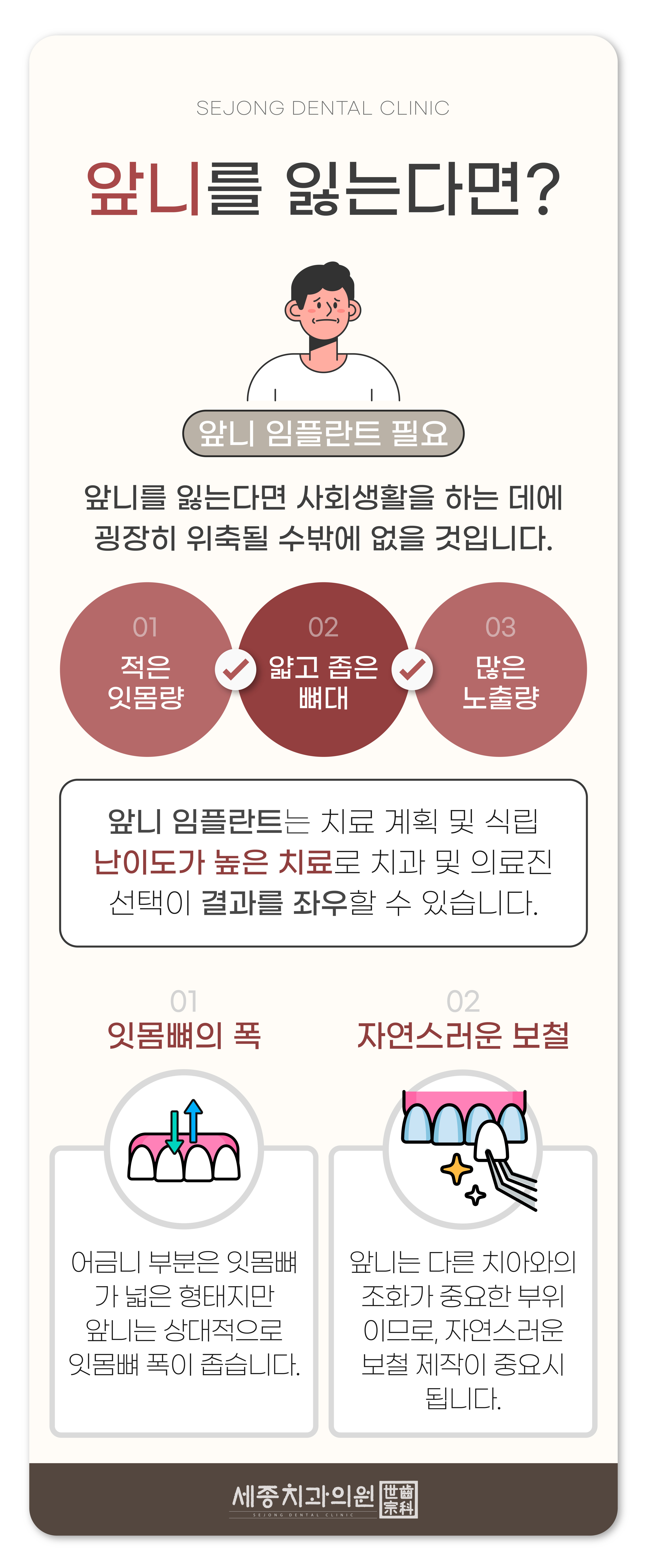 사회생활이 활발한 젊은 층에게는 눈으로 보이는 심미적인 부분도 무시할 수 없겠지요. 앞니를 상실했다면 겉으로 잘 보이는 치아이기 때문에 사람의 인상을 좌우할 수 있어 빠른 치료가 필요합니다. 앞니 임플란트 치료는 다른 부위의 임플란트보다 더 까다로운 치료이기에 신중한 치과 선택이 필요합니다. 내 치아처럼 자연스럽고 주변 치아와 조화를 이루는 등 심미성도 고려해야 하며, 음식물을 잘 자를 수 있는 기능도 회복해야 합니다.