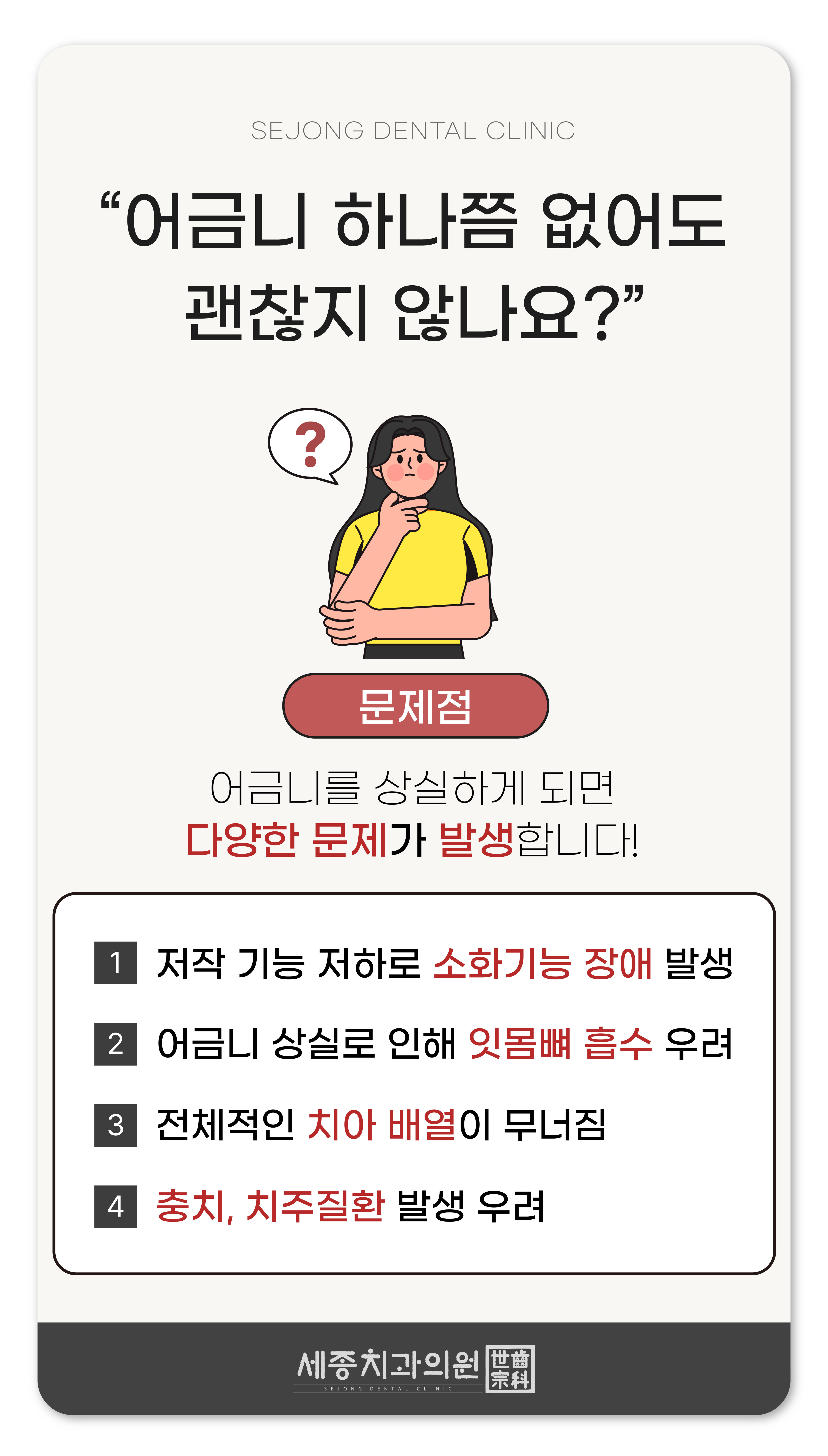 그러나 어금니를 상실하면 다양한 문제가 연달아 발생하므로 치료를 빨리 받는 것이 좋습니다.
