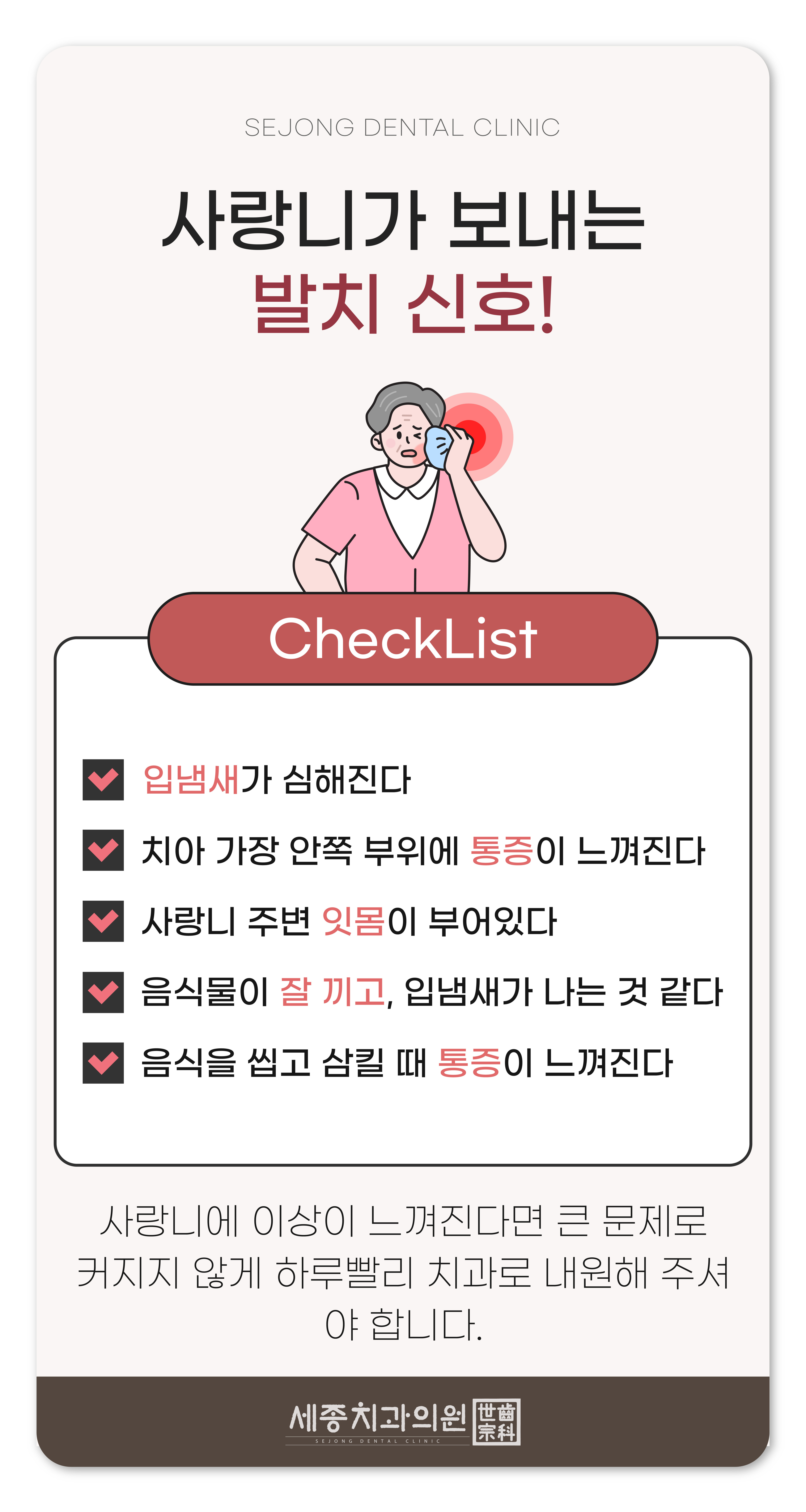 위와 같은 증상이 느껴진다면 사랑니에 이상이 있을 가능성이 높습니다. 사소한 통증이라고 해서, 귀찮다는 이유로 치과 내원을 미루어서는 안됩니다! 작게는 입 냄새, 크게는 잇몸 뼈에 염증까지 일으킬 수 있기 때문에 작은 문제가 큰 문제로 커지지 않게 사랑니에 이상이 느껴진다면 하루빨리 치과로 내원해 주세요.