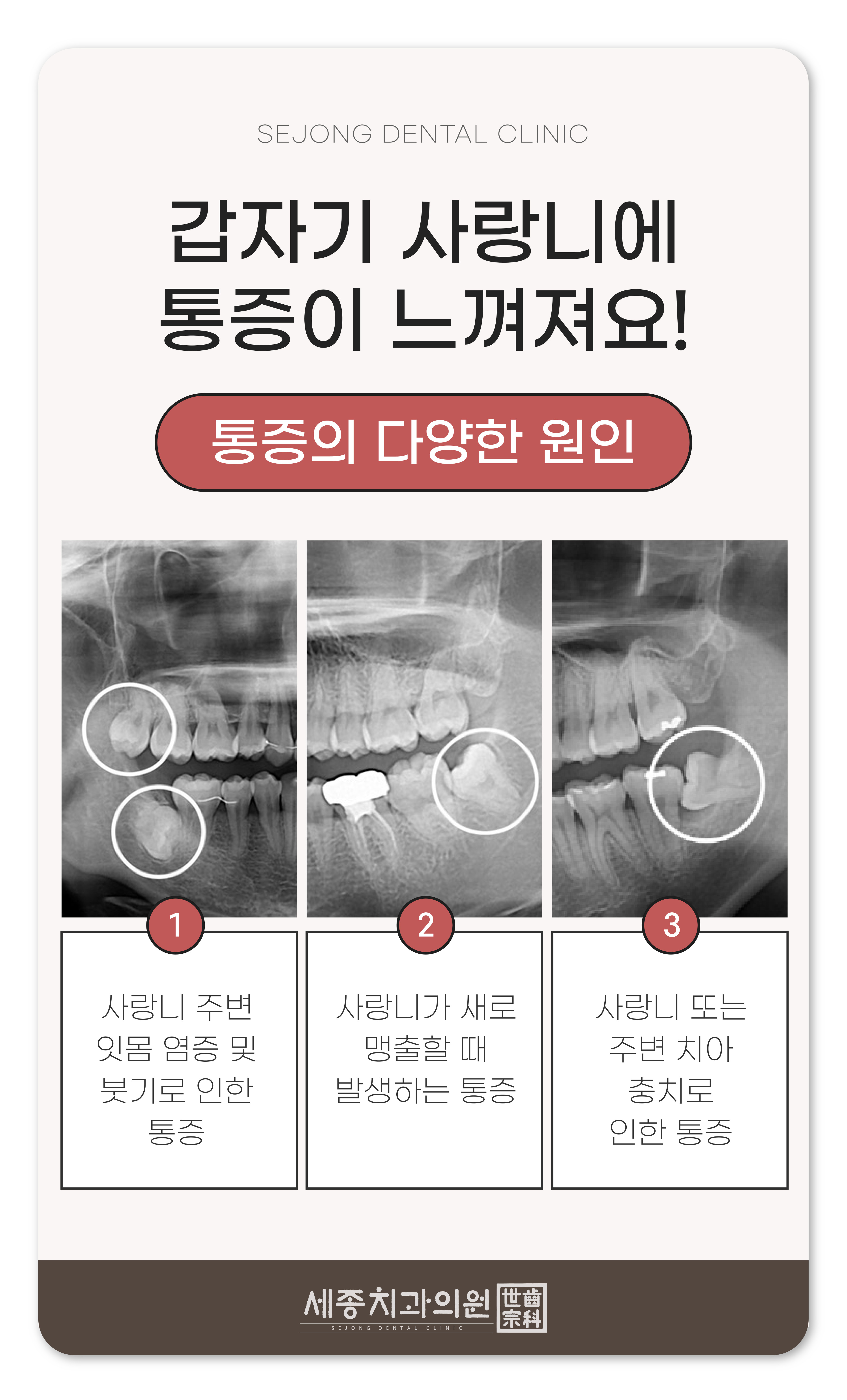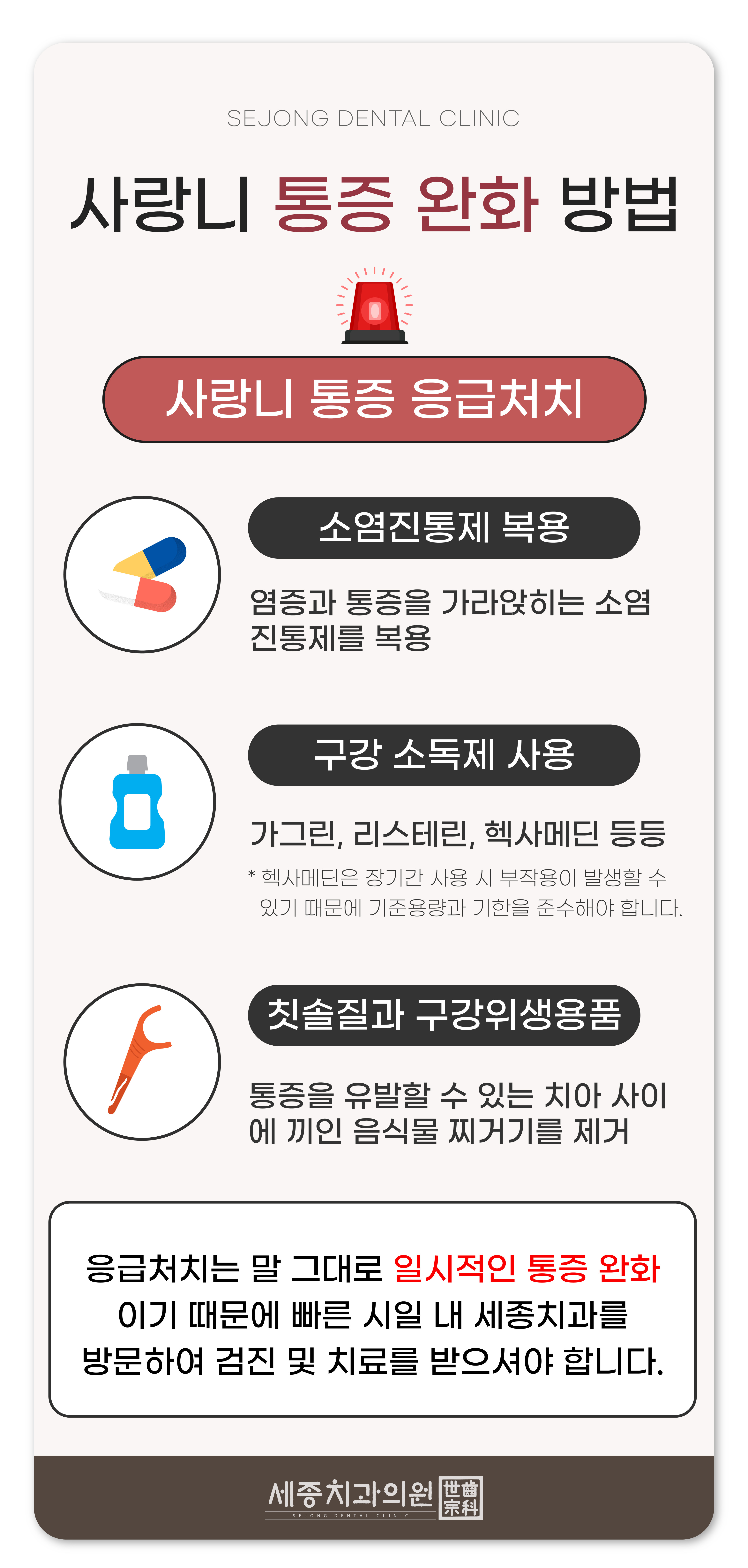사랑니에서 갑자기 통증이 심하게 온다면, 구강 소독제나 소염진통제를 복용해 응급처치로 통증을 완화할 수 있지만, 응급처치는 말 그대로 일시적인 통증을 완화시킬 뿐 언제든지 재발할 수 있습니다. 따라서, 빠른 시일 내 부산사랑니치과 세종치과를 방문하여 검진 및 치료를 받으셔야 합니다.