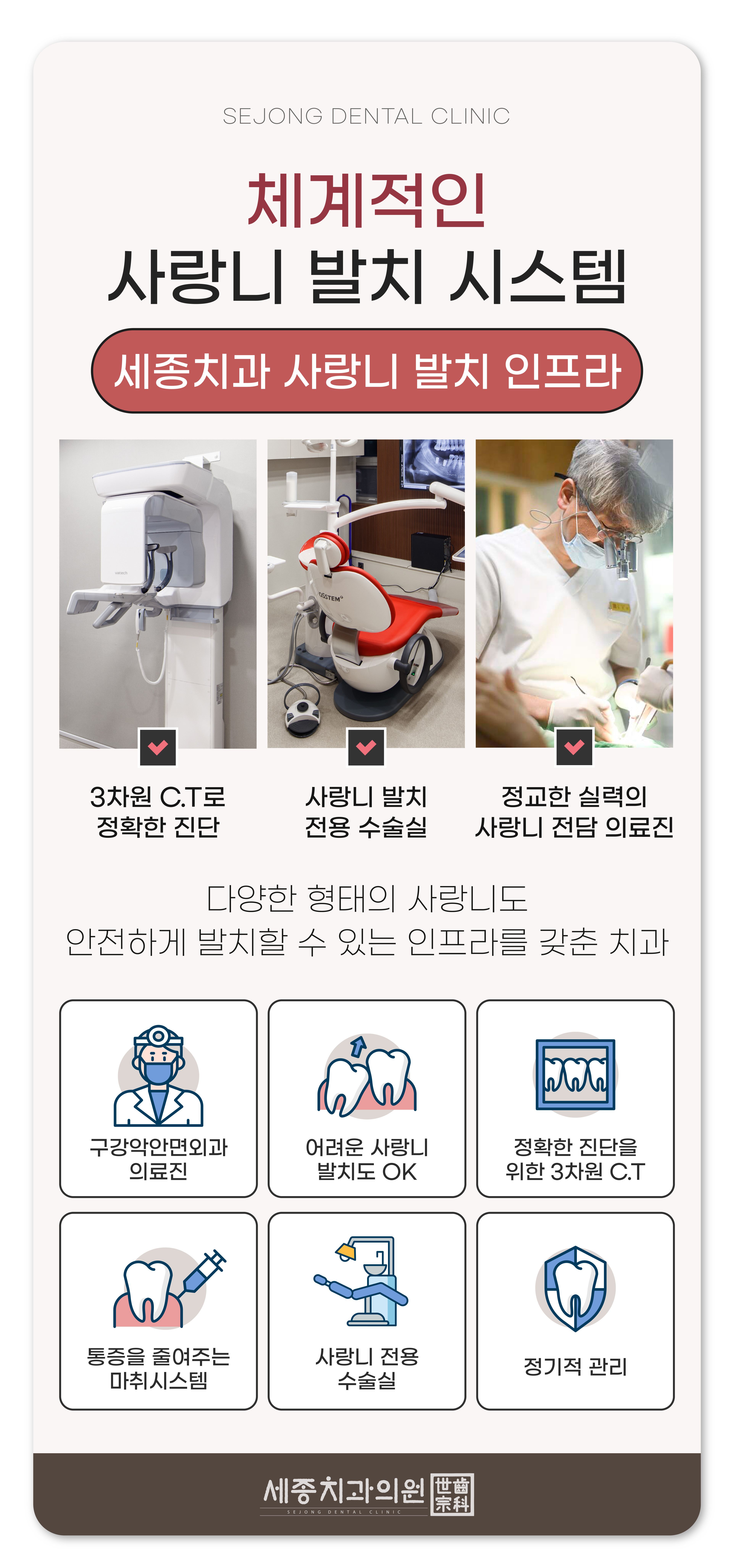 사랑니 때문에 갑자기 통증이 느껴진다면, 미루지 마시고 세종치과에 내원해 주세요! 부산사랑니치과 세종치과의 오랜 경험과 노하우로 편안한 사랑니 발치가 이루어질 수 있도록 하겠습니다.