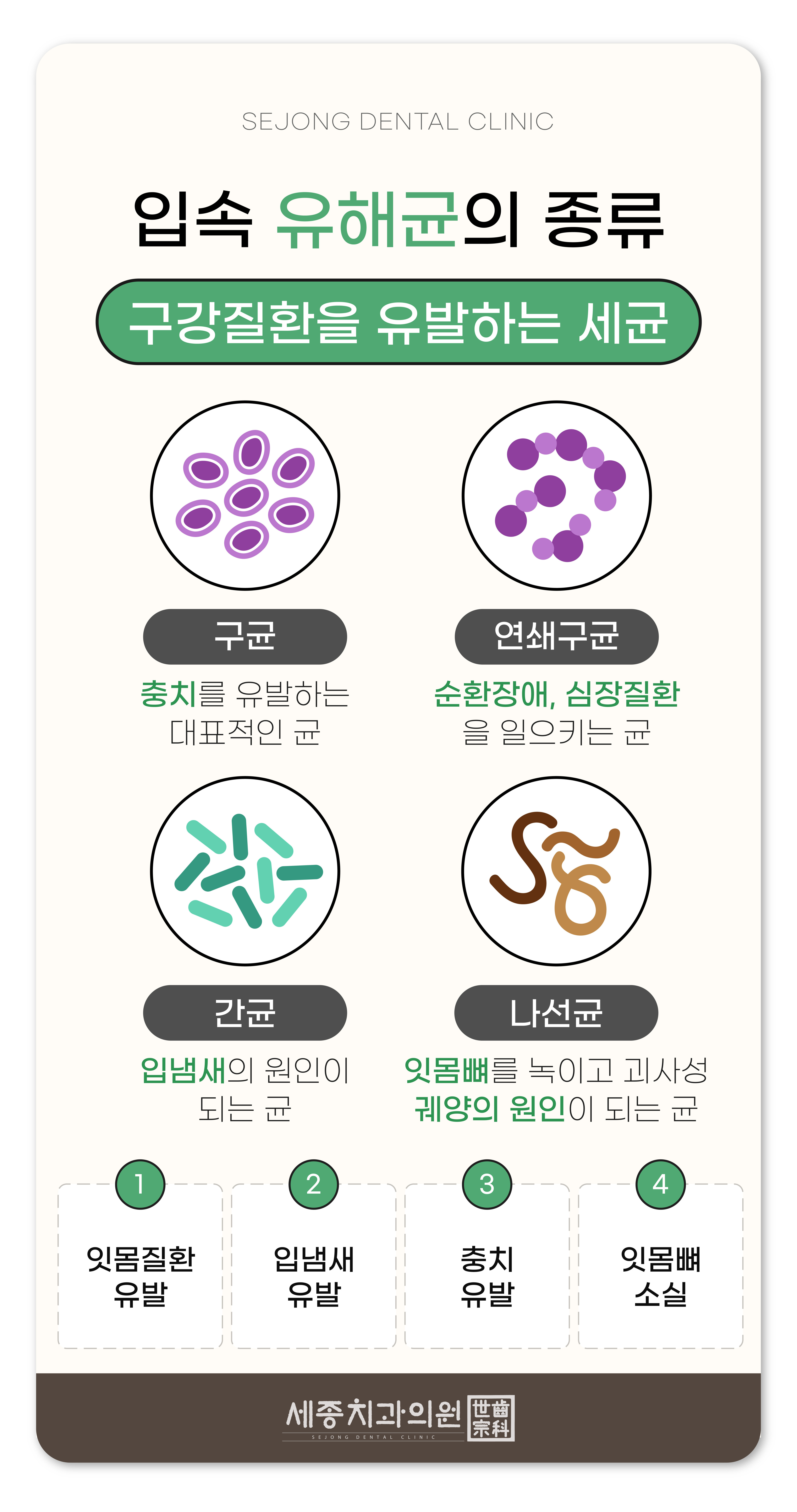 구강 내에는 다양한 세균이 살고 있는데요, 그중 몇 가지 유해균이 문제가 되는 것입니다. 치아, 잇몸에 악영향을 미치는 것뿐 아니라 혈관 등을 통해 몸 안으로 들어가면 전신 건강에도 악영향을 미칠 수 있기 때문에 입속 세균 관리는 중요합니다.