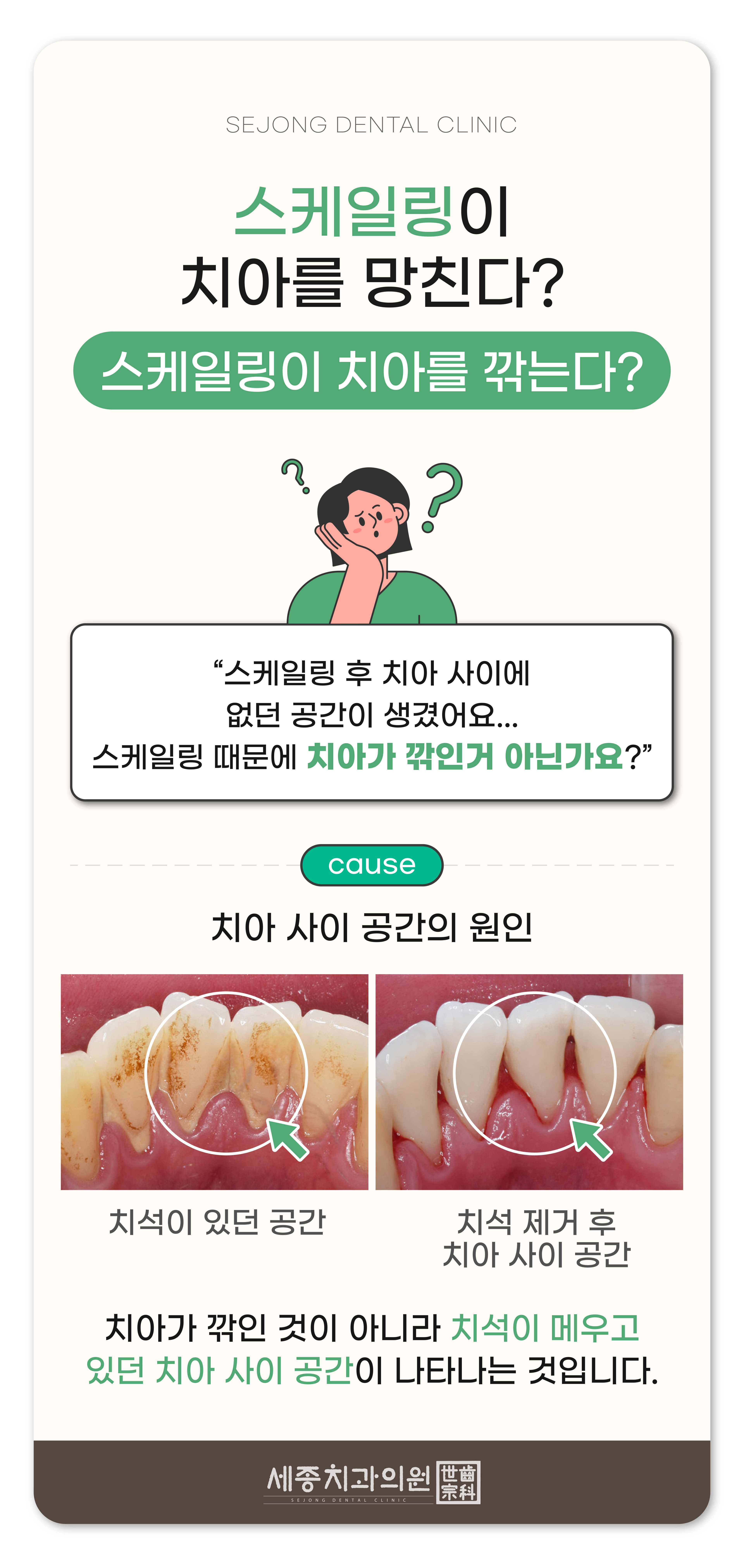몇몇 분들은 스케일링에 대해 오해를 하고 있습니다. 스케일링은 아프다는 오해부터 치아가 깎인다거나 치아와 잇몸 사이가 벌어진 것 같다는 착각 등입니다. 또 스케일링 치료는 치아 사이, 잇몸 사이의 치태와 치석만 제거하므로 치아를 깎아내지는 않습니다. 스케일링 후 빈 공간이 생긴 것 같은 착각은 오랫동안 자리를 차지하고 있던 치석이 없어지면서 느껴지는 착각일 뿐입니다. 스케일링 치료를 정기적으로 잘 받아 평소 치태와 치석이 많지 않다면 이런 통증과 불편감은 거의 느껴지지 않을 것입니다.
