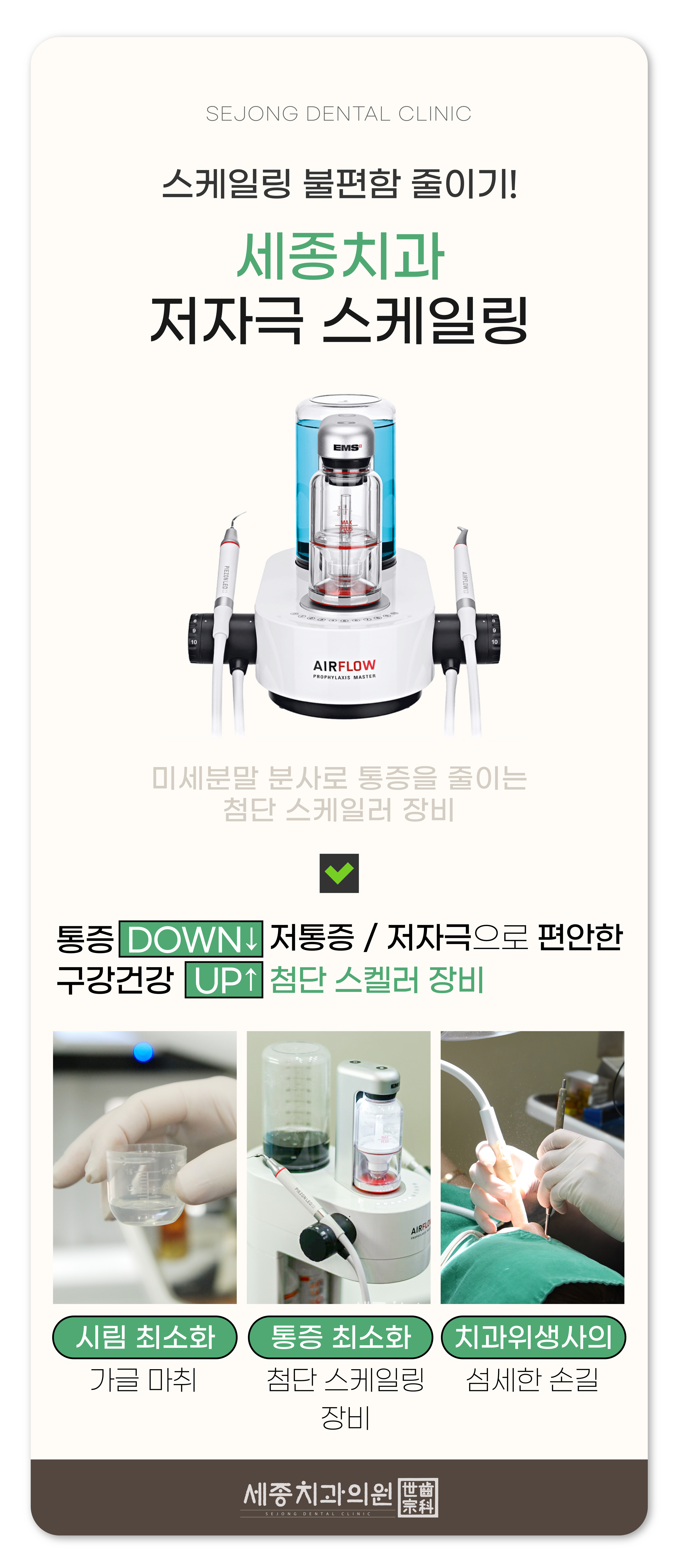 이런 적은 불편감도 줄여드리기 위해 수영구치과추천 세종치과는 최신 치과 장비를 갖췄는데요, 저자극 스케일링 기구는 따뜻한 물이 분사되고 진동을 최소화하여 불편한 느낌을 적게 느낄 수 있습니다.