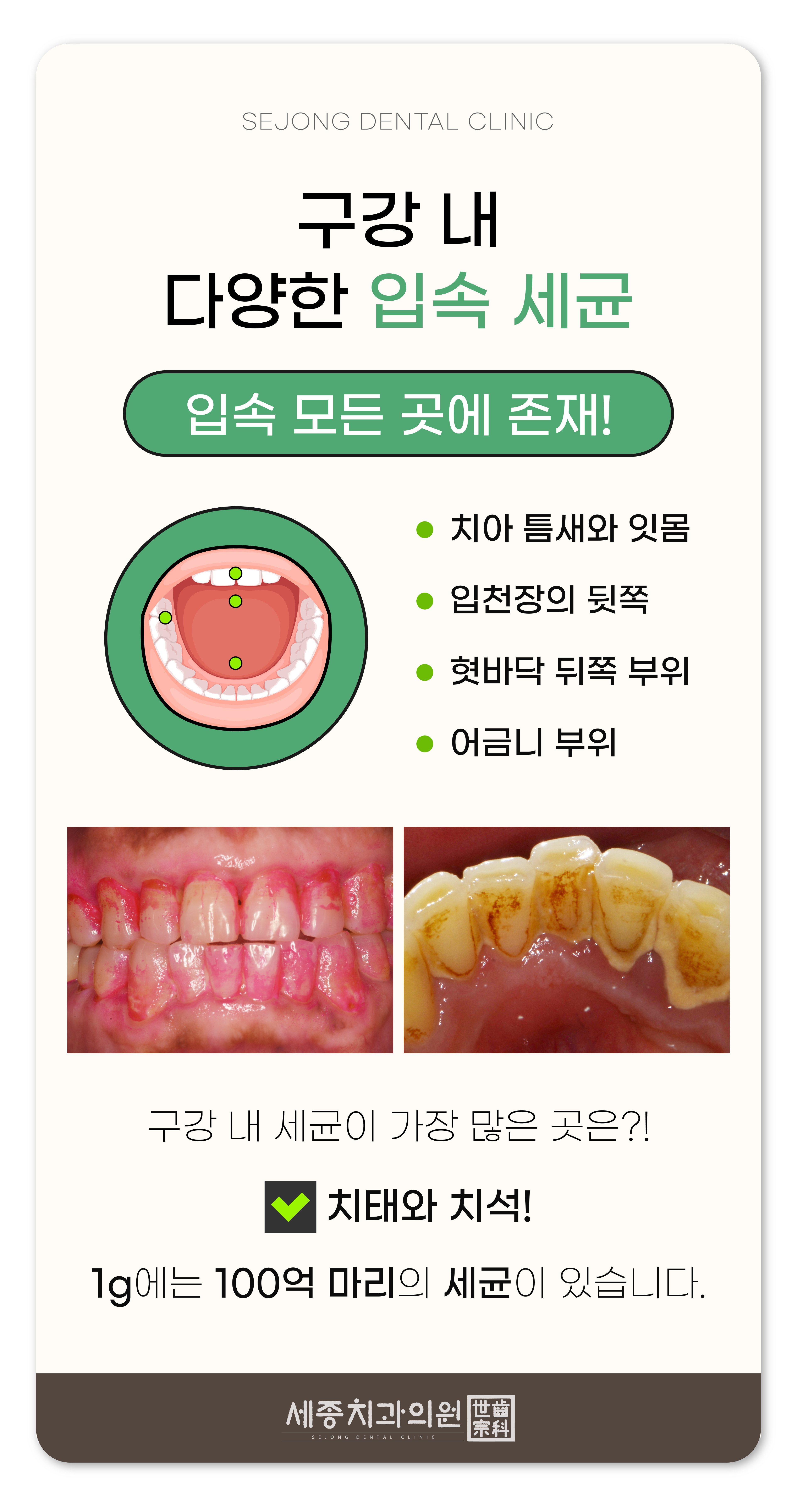 안녕하세요, 수영구치과추천 세종치과입니다. 우리는 지친 하루 끝, 편안한 집에 돌아와서 맛있는 음식을 먹으며 휴식을 취하는데요, 이처럼 세균도 '치석'이라는 집에서 음식물 찌꺼기를 먹으며 개체 수를 늘린답니다. 세균은 치아 틈새, 침, 입천장, 혓바닥 뒤쪽, 잇몸 등 입안 어디든 살고 있지만 치태와 치석에 세균이 가장 많이 서식합니다.