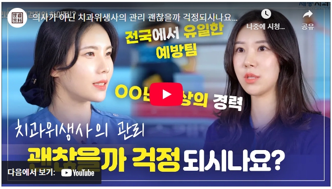 수영구치과추천 세종치과 스케일링 치료는 치과위생학과를 수료하고 국가자격 치과위생사 면허증을 취득한 전문 의료인이 시행합니다. 치과위생사의 고유 업무에는 스케일링이 포함됩니다. 수영구치과추천 세종치과 치과위생사는 오랜 노력과 경험을 토대와 섬세한 노하우로 스케일링해 드립니다. 수영구치과추천 세종치과에서 스케일링 치료가 유독 편안한 비결입니다.