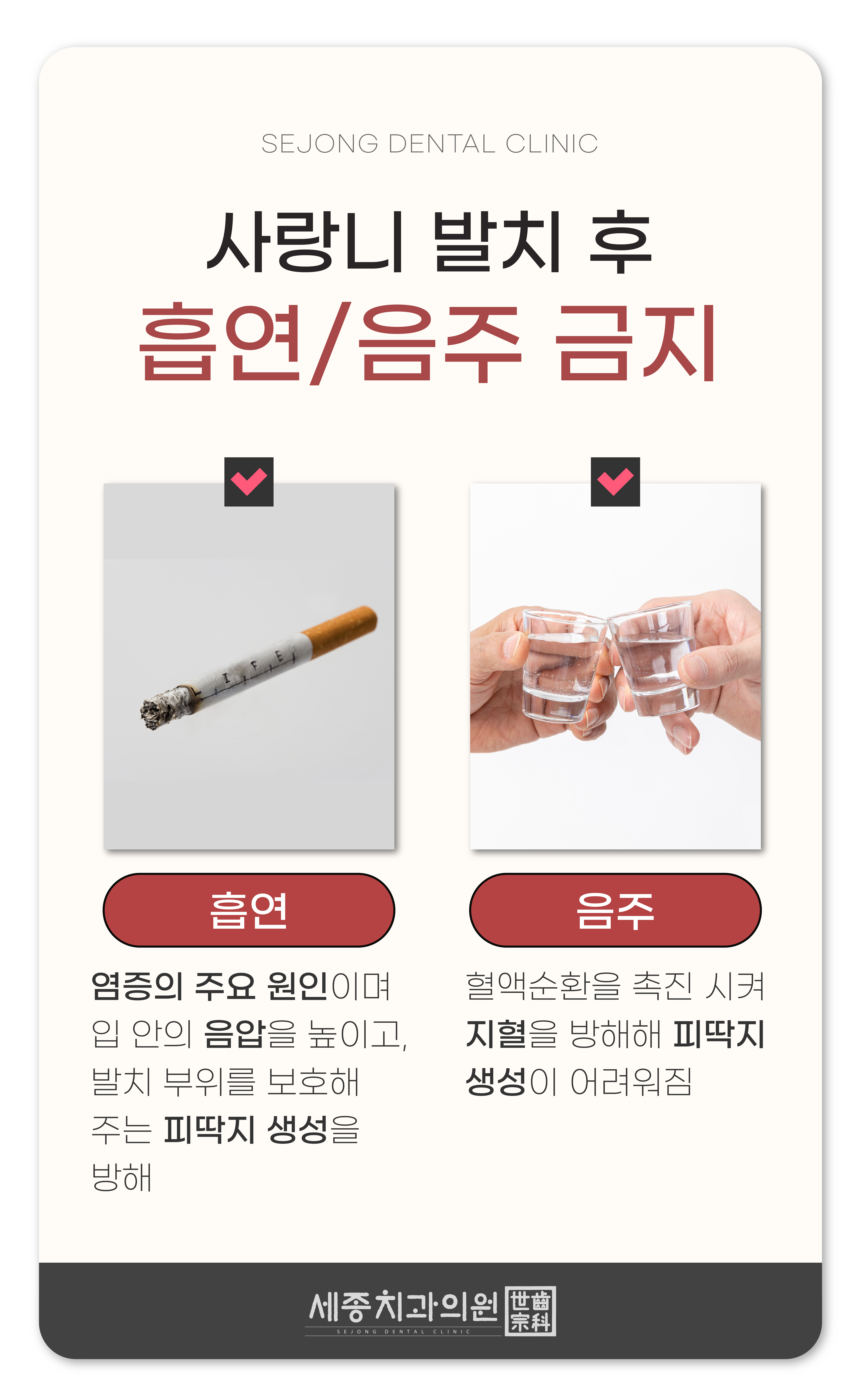 사랑니 발치 후 음주와 흡연은 꼭 피하셔서 발치한 부위가 탈 없이 빨리 회복될 수 있도록 해주세요!