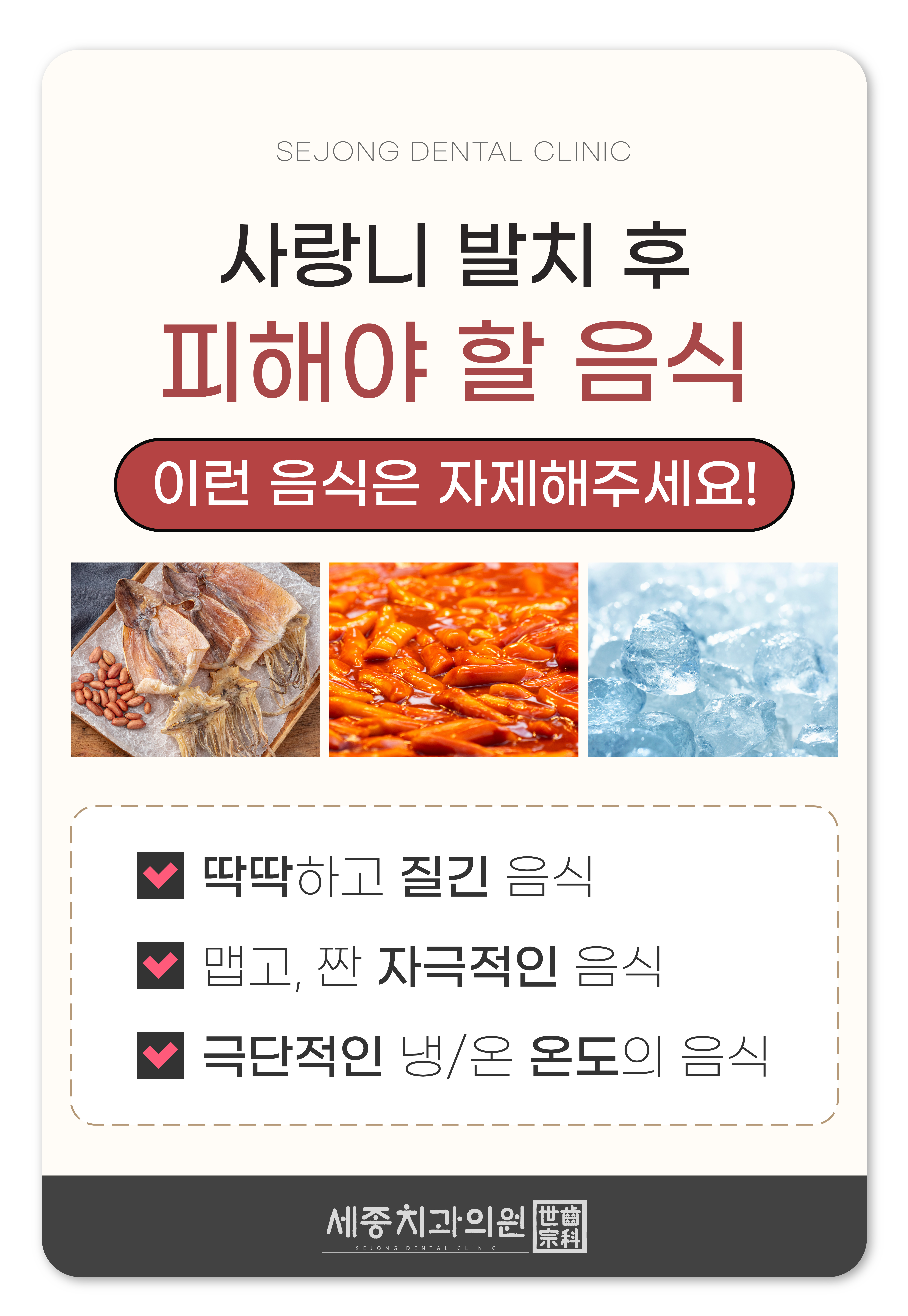 < 사랑니 발치 후 금지 음식 > 1. 딱딱하고 질긴 음식 2. 맵고 짜고 자극적인 음식 3. 극단적으로 차갑고 뜨거운 음식 피해야 할 음식은 뜨거운 음식과 음료, 견과류와 오징어, 껌처럼 딱딱하고 질긴 음식은 씹는 과정에서 상처 부위를 자극할 수 있으며, 너무 차갑거나 너무 뜨거운 극단적인 온도는 상처에 악영향을 줄 수 있습니다. 사랑니 발치 후 2~3일 이후부터는 밥과 반찬, 국 등의 일반식을 드셔도 되지만 씹기 힘든 음식은 피해하는 것이 좋습니다.