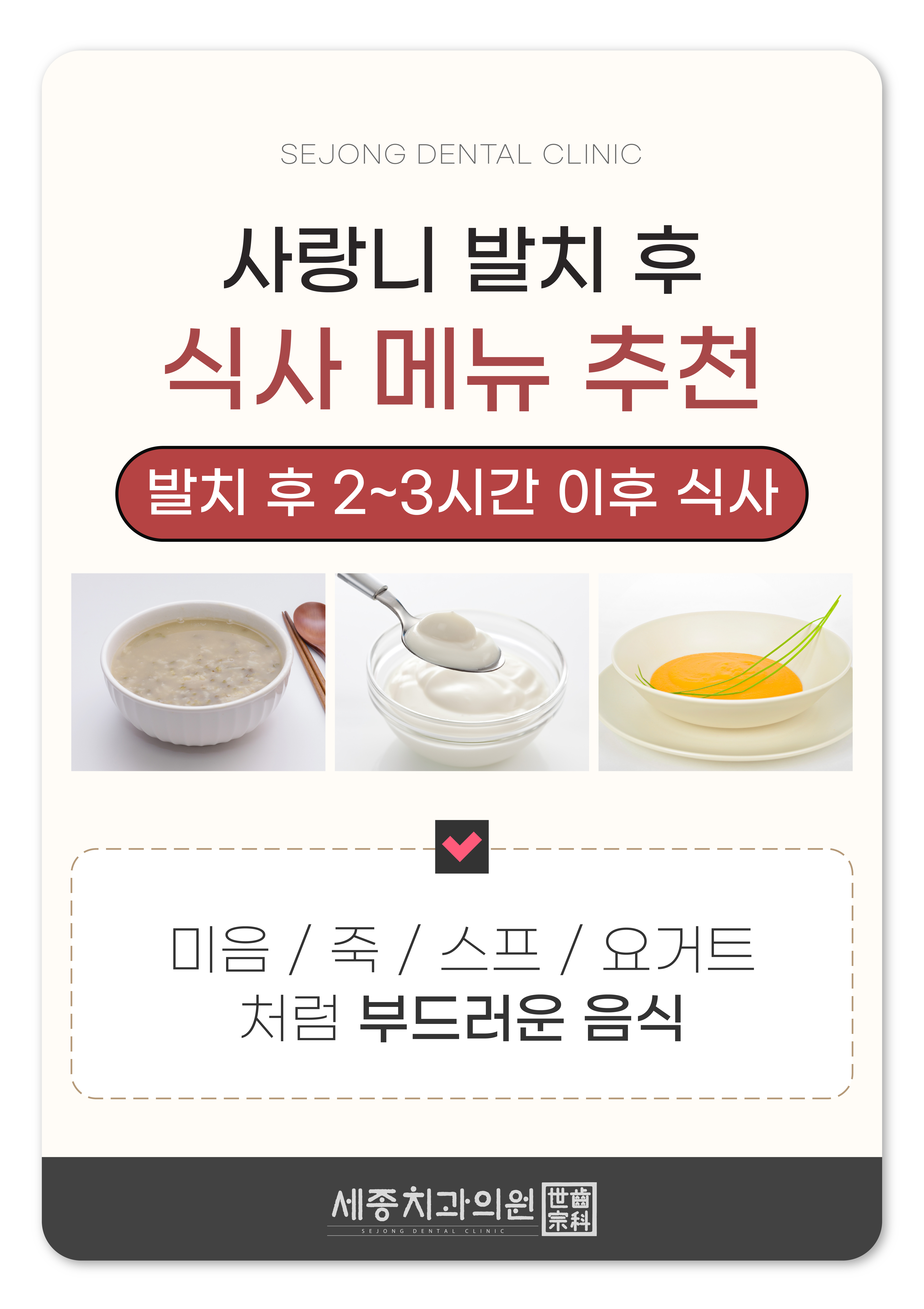 사랑니 발치 후 식사는 2~3시간 이후에 해주세요. 마취가 깨지 않아 입안에 감각이 없는 상태이기 때문에 혀나 입안을 씹을 수 있어, 2~3시간 이후 마취가 깨고 감각이 돌아오면 미음이나 죽, 수프, 플레인 요거트 처럼 부드럽고 자극적이지 않는 음식을 드시는 것을 추천드릴 수 있습니다.