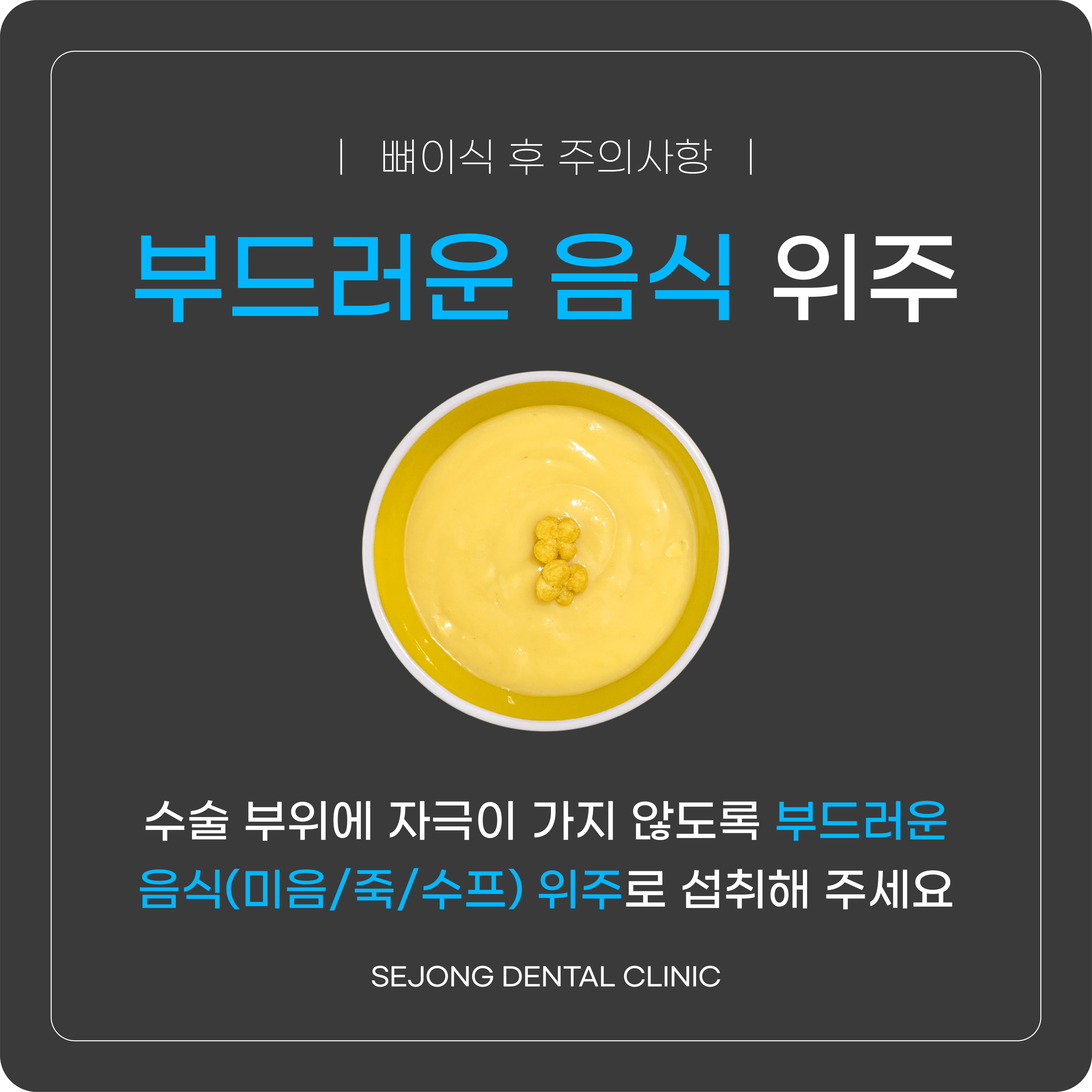 수술 부위에 자극이 가지 않도록 미음, 죽, 수프와 같은 부드러운 음식 위주로 섭취해 주세요. 뜨겁거나 자극적인 음식은 피해주세요.