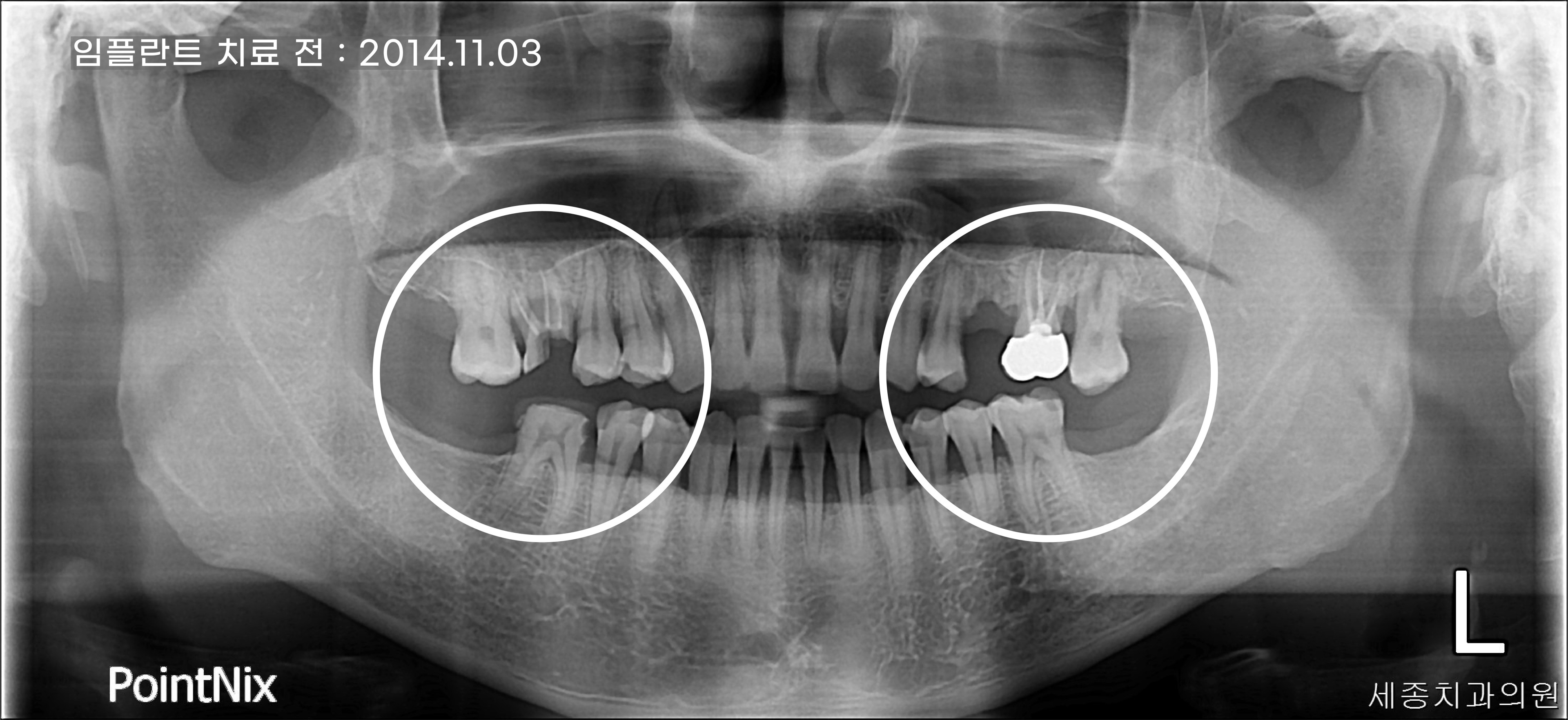 상악의 좌측 어금니는 치아 자체에는 문제가 없어 보이지만 다른 치아에 비해 아래로 쳐진 것을 확인할 수 있는데요. 치아 상실을 오래 방치하게 되면 맞물리는 치아가 없어 치아가 점점 아래로 내려오기 때문에 건강했던 치아마저 임플란트 치료를 할 수밖에 없습니다. 세종치과는 자연치아 살리기를 최우선으로 임하고 있지만 이런 경우에는 과감하게 발치가 필요하다고 말씀드립니다.