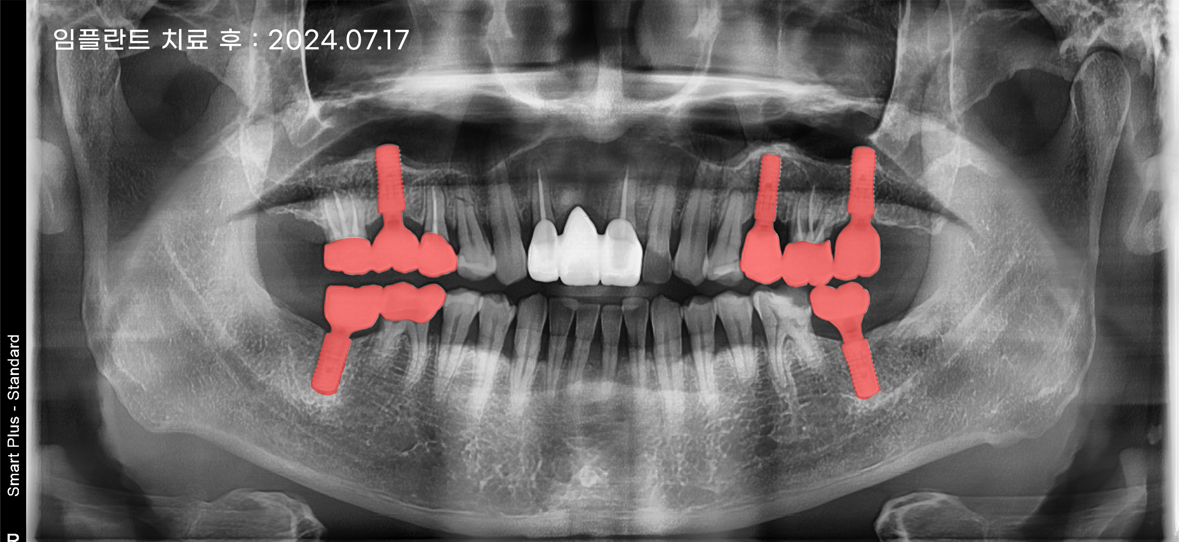 부러진 치아의 면적이 커서 남아 있는 치아를 살리기에는 치아 기둥이 너무 짧아 살리기 어려운 상태로 판단되어 치아를 발치하고 임플란트를 식립하기로 했습니다. 그 외에 하악의 양쪽 어금니와 상악의 상실된 치아도 임플란트를 식립하여 안정적인 구강 환경을 되찾아 드릴 수 있게 치료 계획을 세우게 되었습니다.