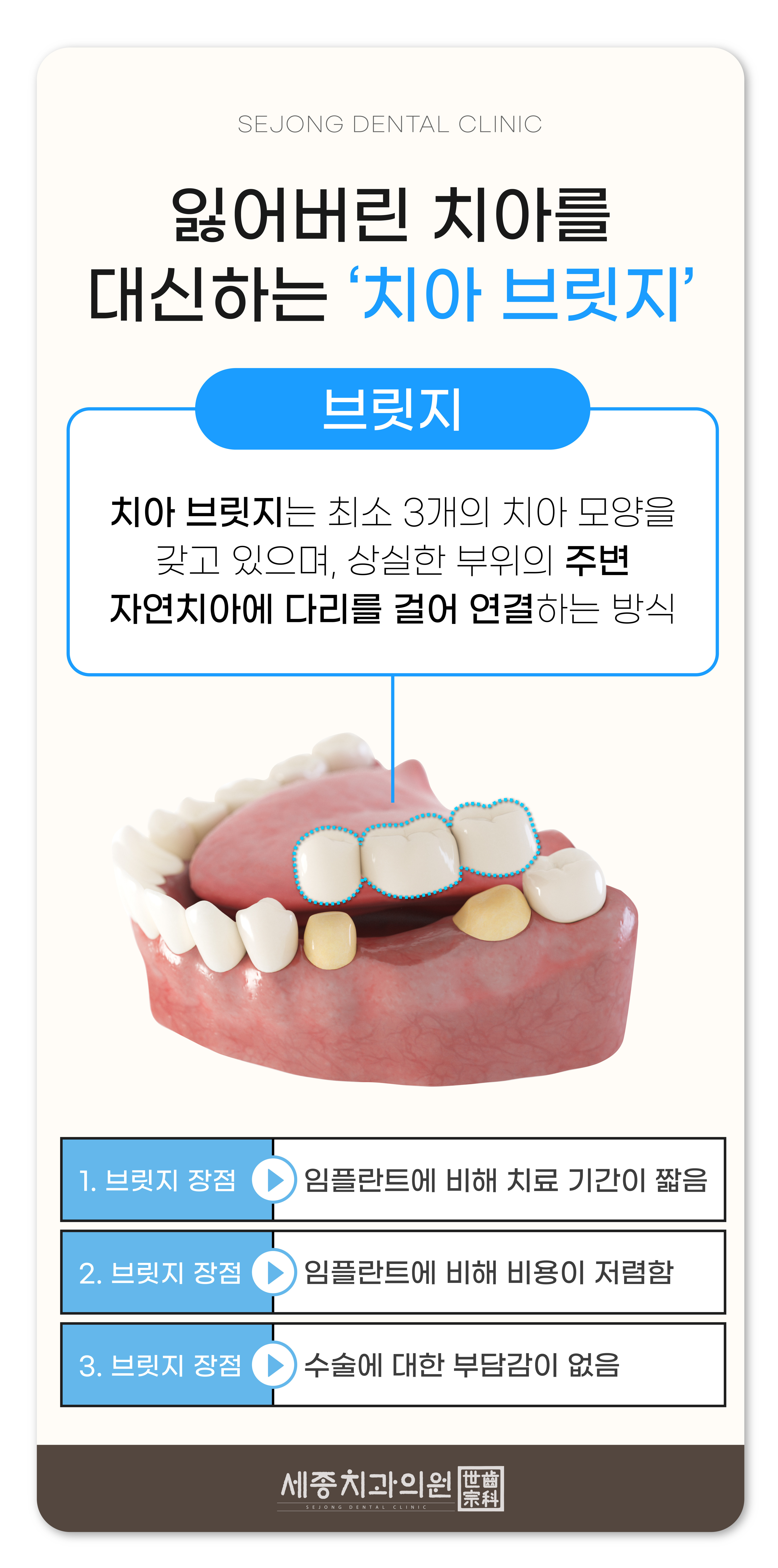 이렇게 임플란트와 브릿지는 조건에 따라 장점이 되기도 하고 단점이 되기도 합니다. 환자분에게 알맞은 치료를 위해 부산임플란트 세종치과 의료진과의 상담을 통해 좋은 방법을 선택하시길 바랍니다.