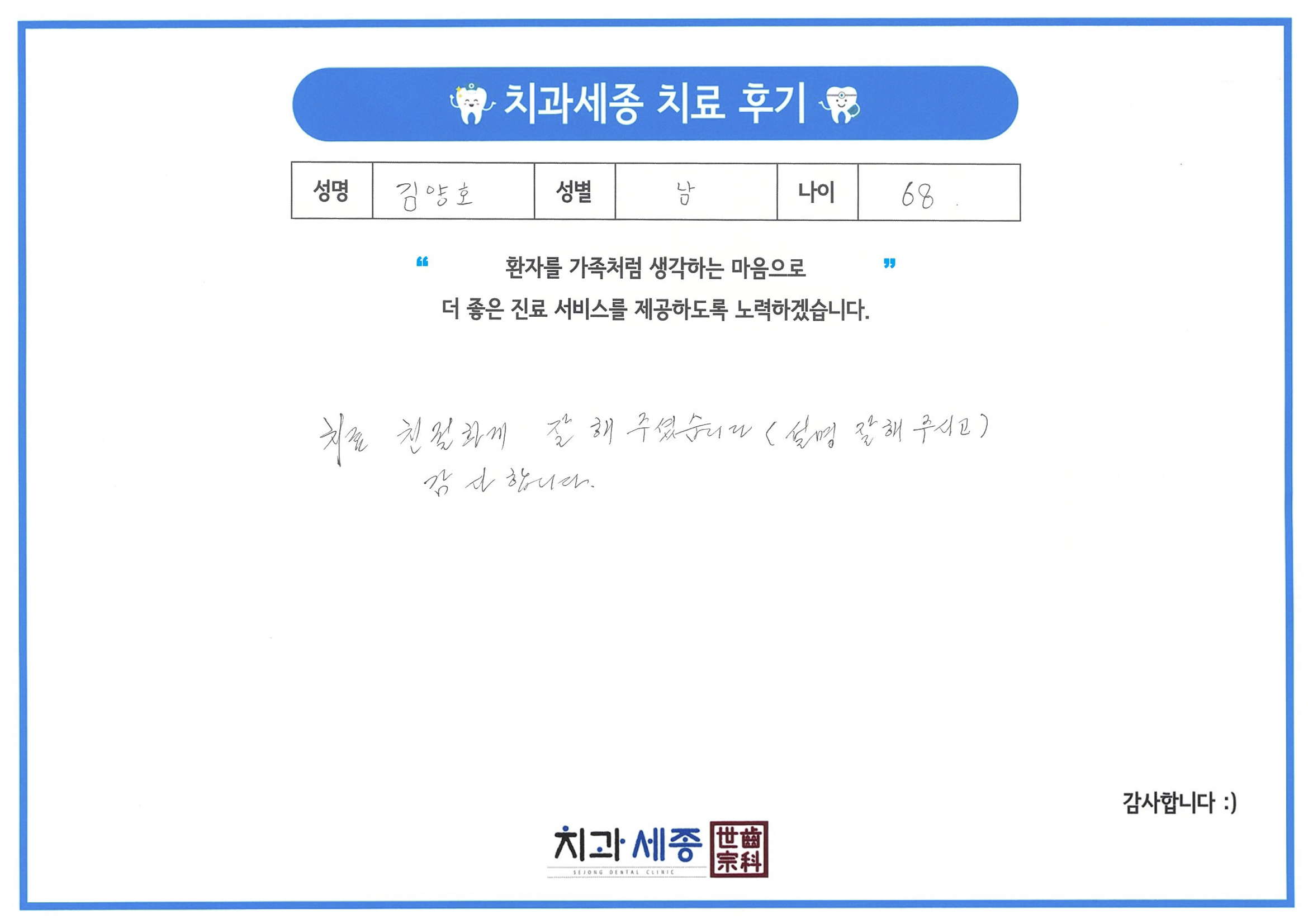 김양호님의 직접 써주신 치료 종결 후기글입니다