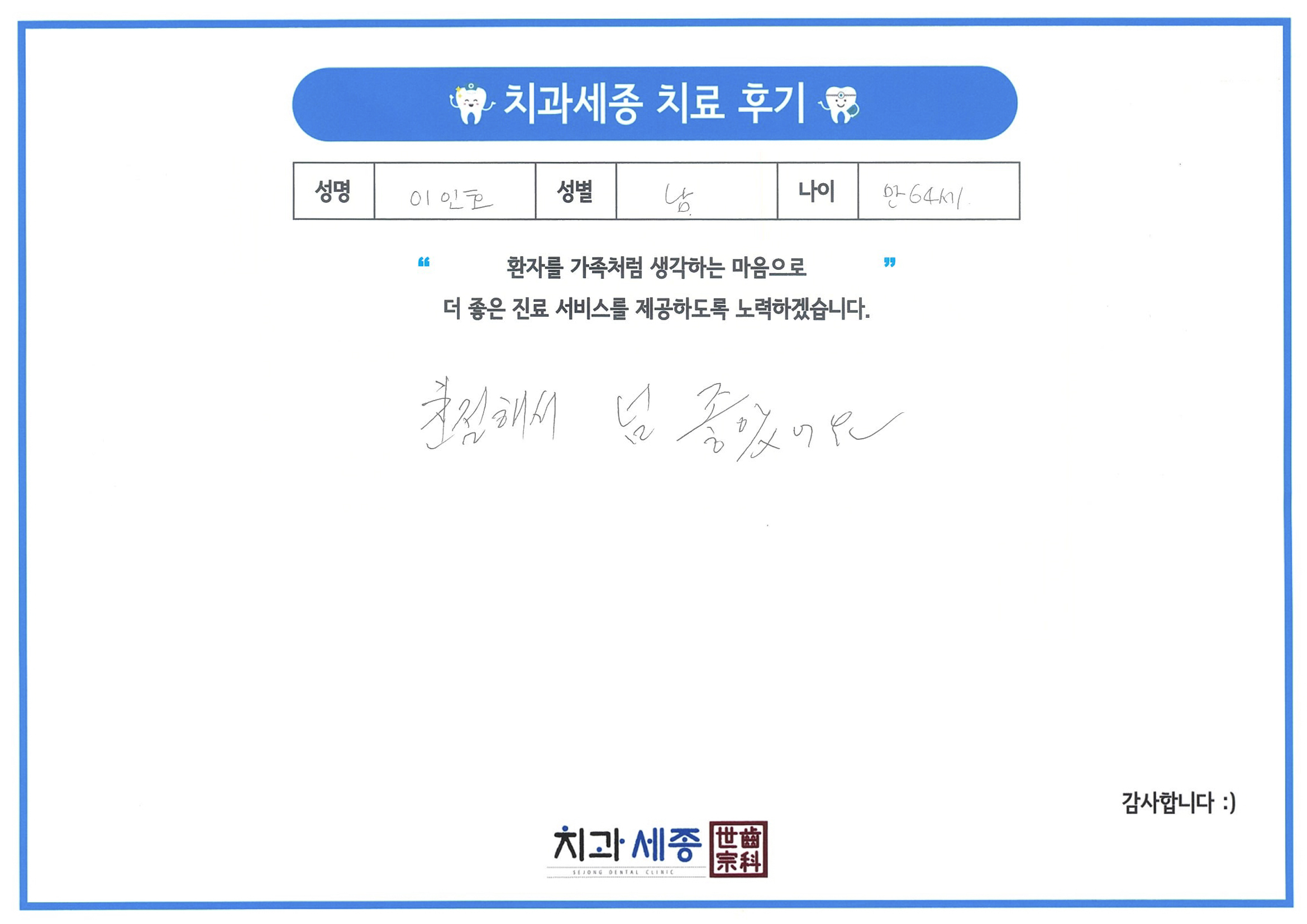 이인호님의 직접 써주신 치료 종결 후기글입니다